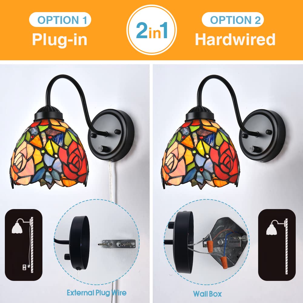 Q: How can I install the Tiffany wall sconce?A: You have two installation options for the Tiffany wall sconce. You can either use the regular US plug to connect it to a power source or cut the wire and connect it directly to the embedded wall wires for a more permanent installation.