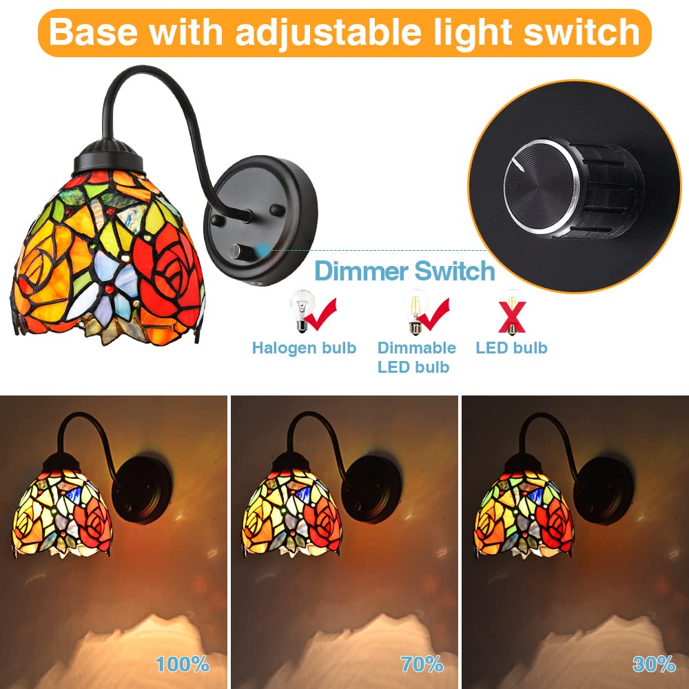 Q: What types of bulbs are compatible with the Tiffany Bedside Wall Mount Lamp?A: The Tiffany Bedside Wall Mount Lamp is compatible with dimmable LED bulbs and halogen bulbs. For optimal performance, use bulbs that work with the dimmer switch feature.