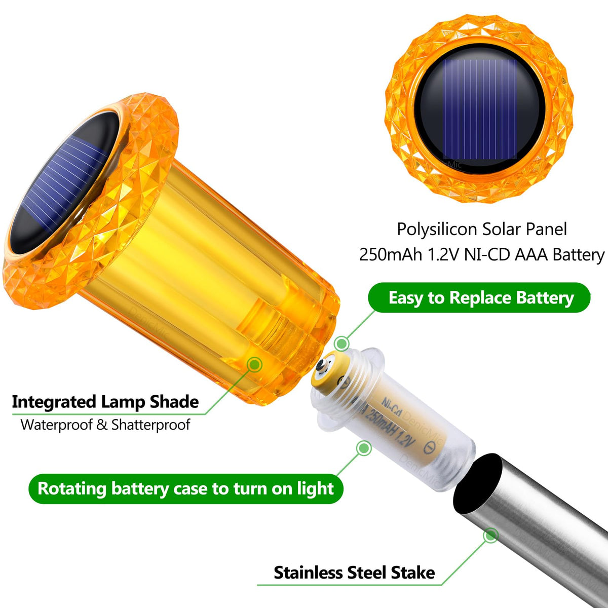 Q: What materials are used in the construction of DenicMic Solar Lights?A: The lamp head is made of highly transparent acrylic, while the stakes are made of durable stainless steel, ensuring longevity and outdoor durability.