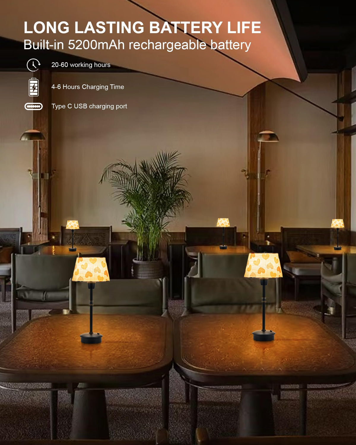 Q: How long does the battery last on the Depecal Cordless Table Lamp?A: The Depecal Cordless Table Lamp features a built-in 5200mAh rechargeable battery that provides 20-60 hours of continuous lighting on a single charge, depending on the brightness setting used.