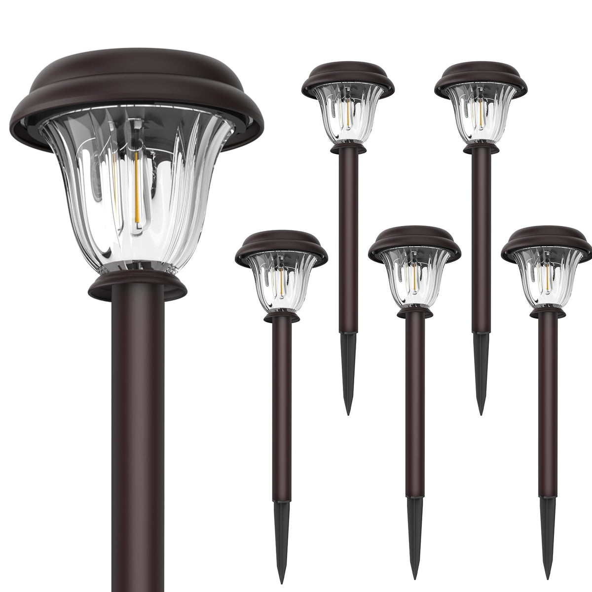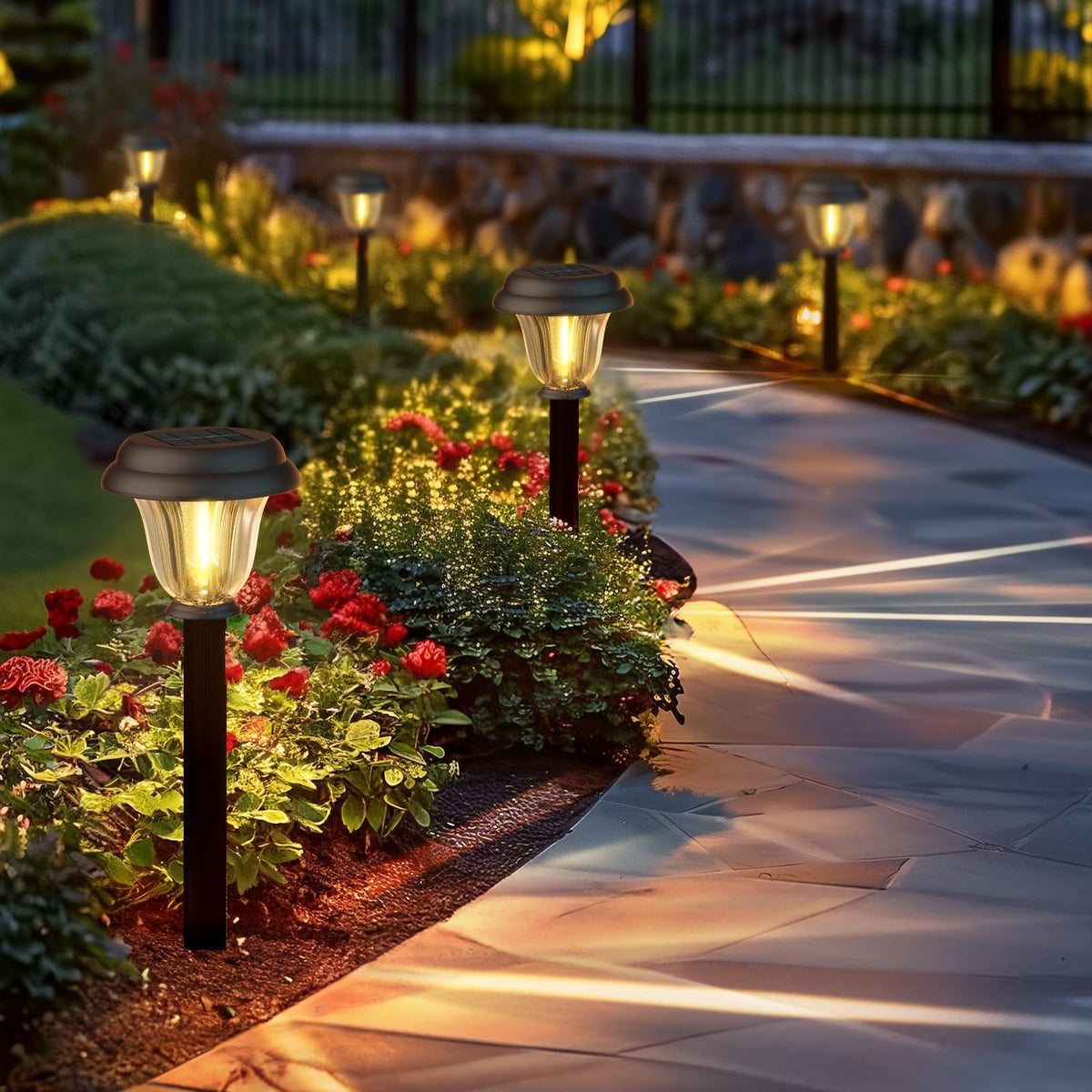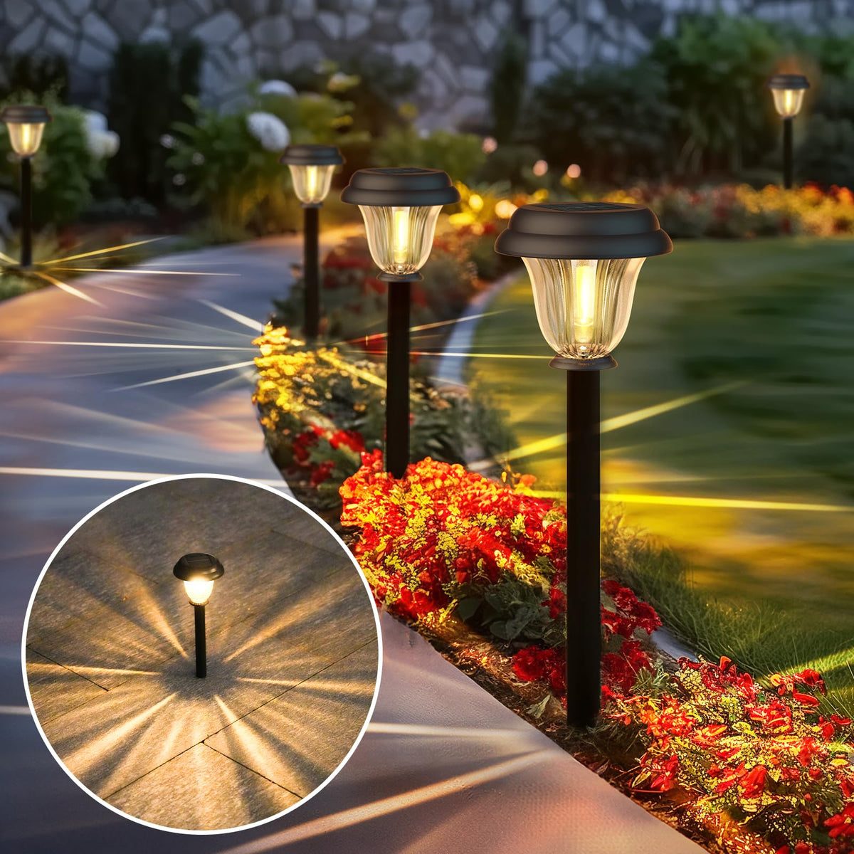 When night falls, path gently illuminated by a brilliant starlight pattern, like a dreamy Milky Way falling to the ground, instantly adding an unparalleled charm and warmth to your courtyard, garden, or driveway. These solar pathway lights are meticulously crafted from high-quality stainless steel. Not only are they sturdy and durable, able to withstand all kinds of harsh outdoor environments, such as the erosion of wind and rain and the scorching sun, but their stylish and simple design also complements any outdoor decoration style, making them a beautiful sight in your outdoor landscape. The unique corrugated glass lampshade is truly the icing on the cake. The built-in 1000mAh high-capacity battery, combined with the latest high-efficiency solar panel, ensures that the light can fully absorb and store solar energy during the day. Even on days when the sunlight is not so full, it can still provide you with long-lasting and stable lighting. You just need to easily insert the pathway lights into the ground. There 's no need for complicated wiring or additional electricity costs. It will automatically turn on at dusk and turn off at dawn, which is both smart and convenient. Many customers have been full of praise after using it. They have said that it not only enhances the beauty of the outdoor space but also brings more convenience and romance to their lives. Let your outdoor life be lit up by starlight from now on and embark on a poetic and warm journey of light and shadow.