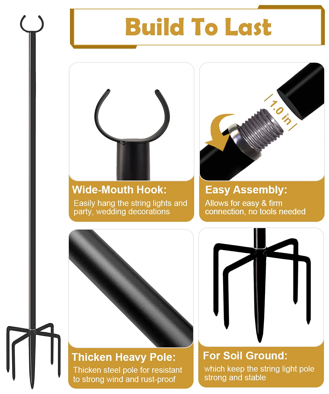 - The string light poles are perfect for hanging holiday decorations, such as commercial grade lights, bunting, fairy light, mason jars, lantern, wind bells, Christmas decorations, Halloween decorations and more.