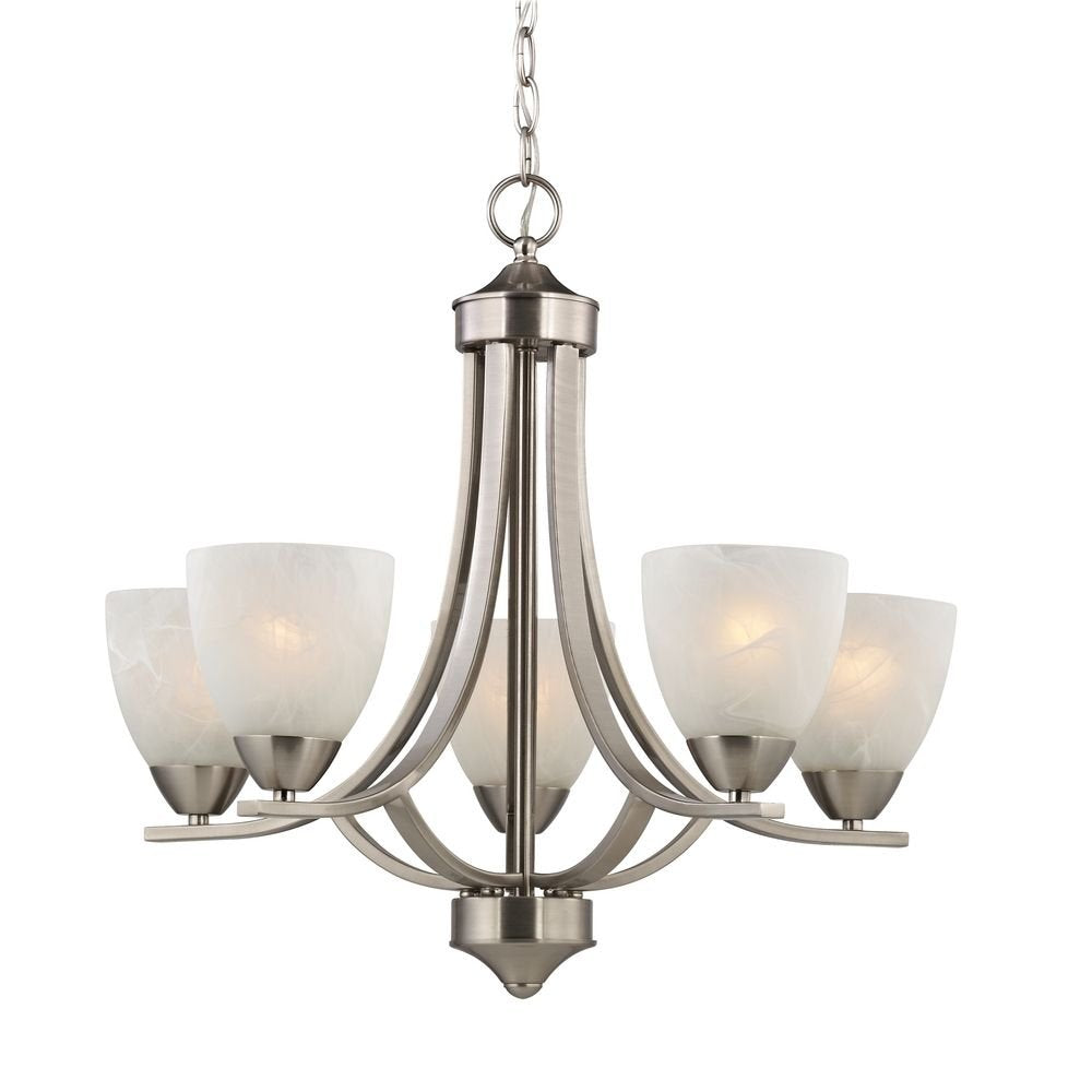 Q: What type of light bulbs does the Design Classics 5-Light Chandelier require?A: The Design Classics 5-Light Chandelier requires five 100-watt medium base frosted light bulbs, which are not included with the fixture.