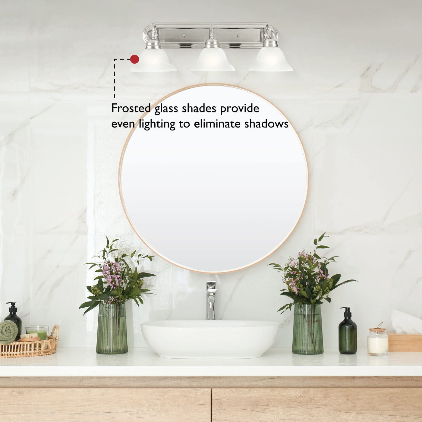 Enhance your bathroom with the Design House Millbridge 3-Light Vanity Light, featuring a satin nickel finish and frosted glass shades that bring a touch of elegance to any space. Designed with a large backplate, this fixture minimizes wall touchups and drywall repairs, making it perfect for renovation projects. Constructed from durable formed steel, it provides both style and longevity. Measuring 8.5 inches in height, 26.5 inches in length, and 8.5 inches in depth, this vanity light is ideal for mounting above bathroom mirrors or vanities. The fixture accommodates three 60-watt medium base bulbs or LED equivalents (bulbs not included), offering flexibility in lighting options. Fully dimmable when paired with a compatible dimmer switch (sold separately), it allows you to create the perfect ambiance for your space. This product is cETL/ETL Listed for use in damp locations. With a 10-year limited warranty, Design House provides quality lighting solutions that suit every taste and budget.