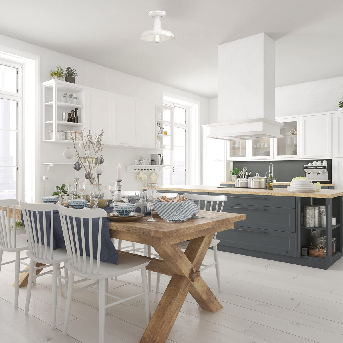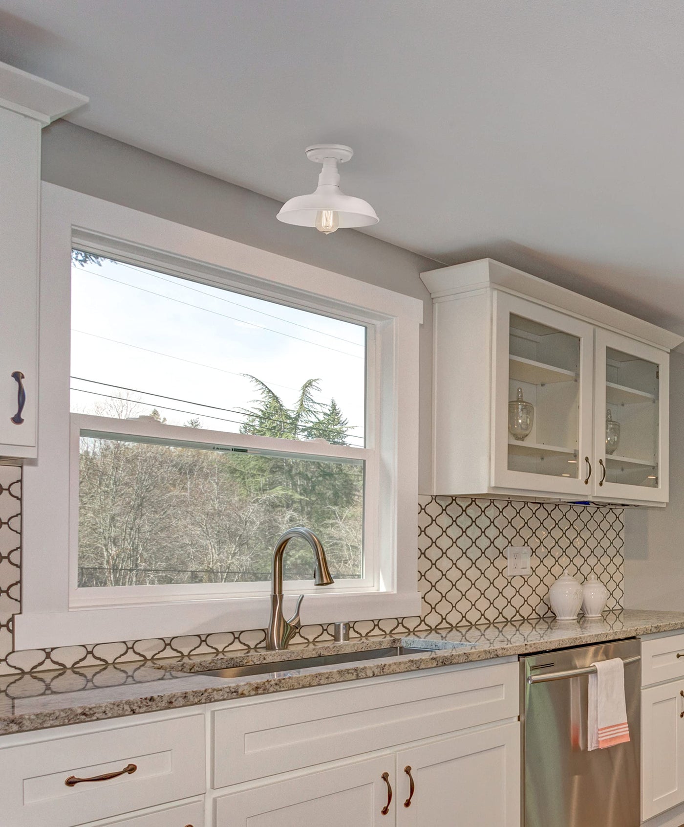 The Design House 579631 Semi-Flush Ceiling Light features an industrial design and an antique white finish with a metal shade designed for any room, including a hallway or foyer. The ceiling light offers reliable lighting with a rustic design and is made for ceiling mount applications. This model uses (1) 60-watt medium-base bulb. The metal shade measures 11inch in diameter. The fixture hangs down 7.87inch from the ceiling. This unit is ETL/cETL Listed and suitable for indoor use in dry locations.