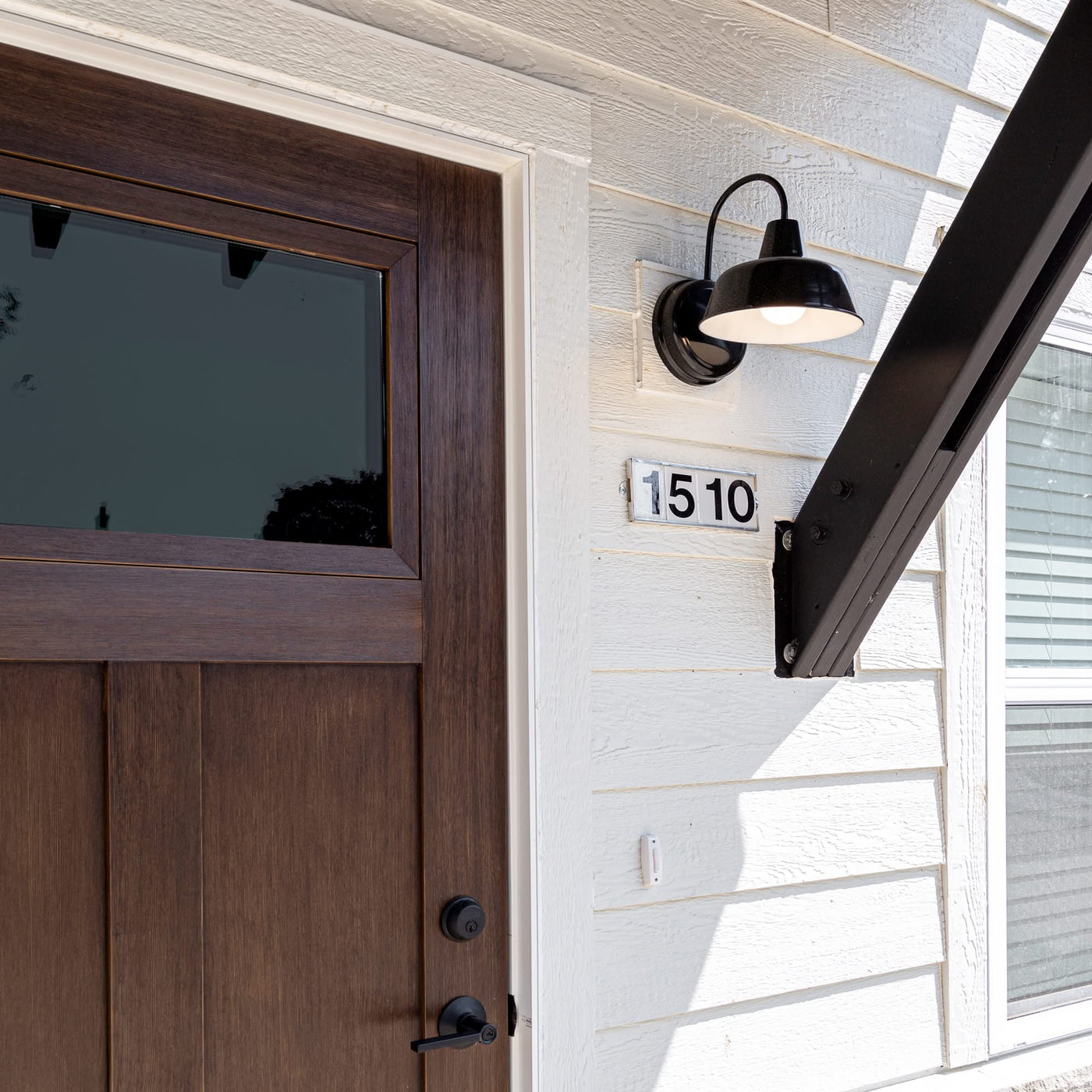 Q: What are the dimensions of the Design House Mason Barn Light?A: The dimensions of the Mason Barn Light are 11 inches in height, 8.38 inches in width, and 10.5 inches in depth.
