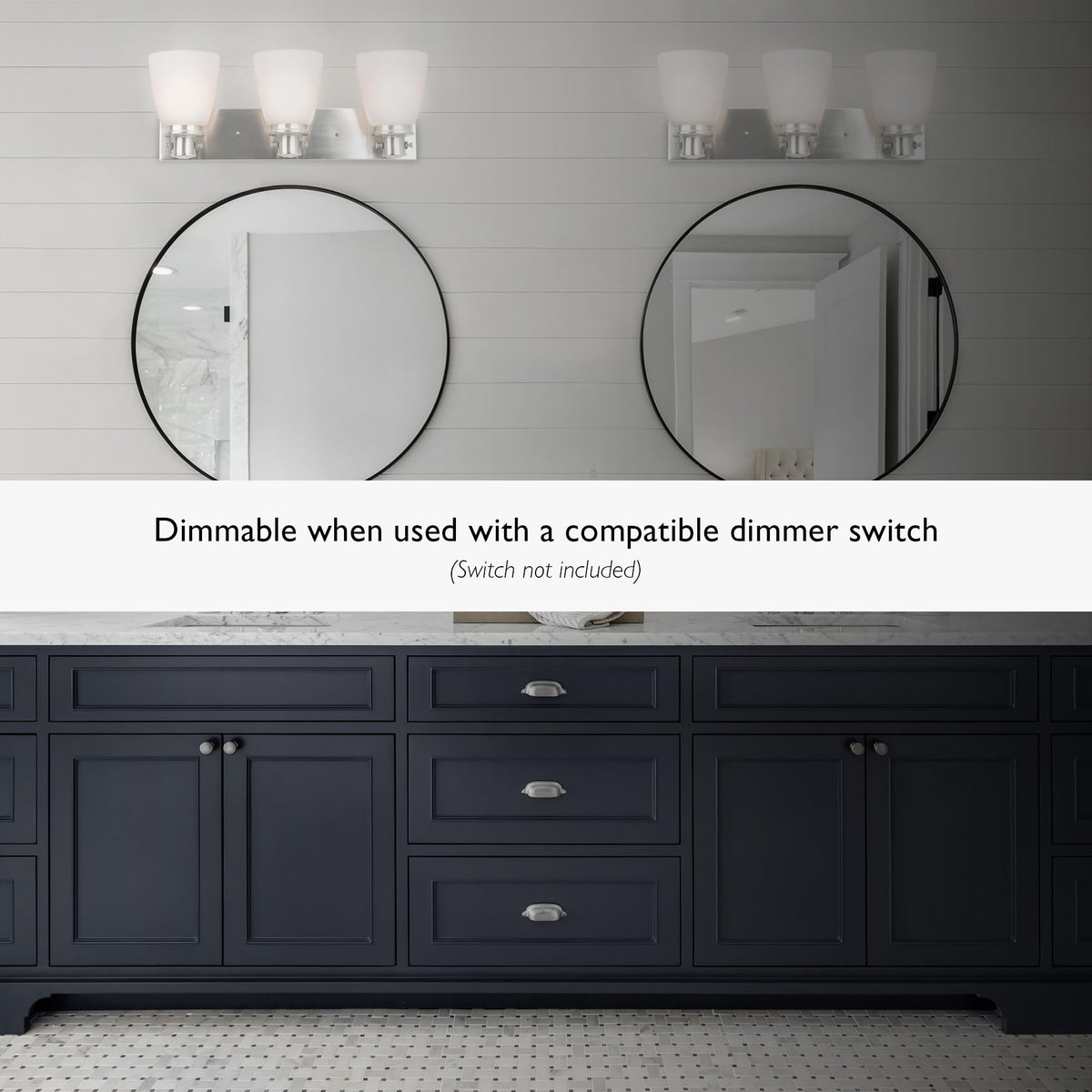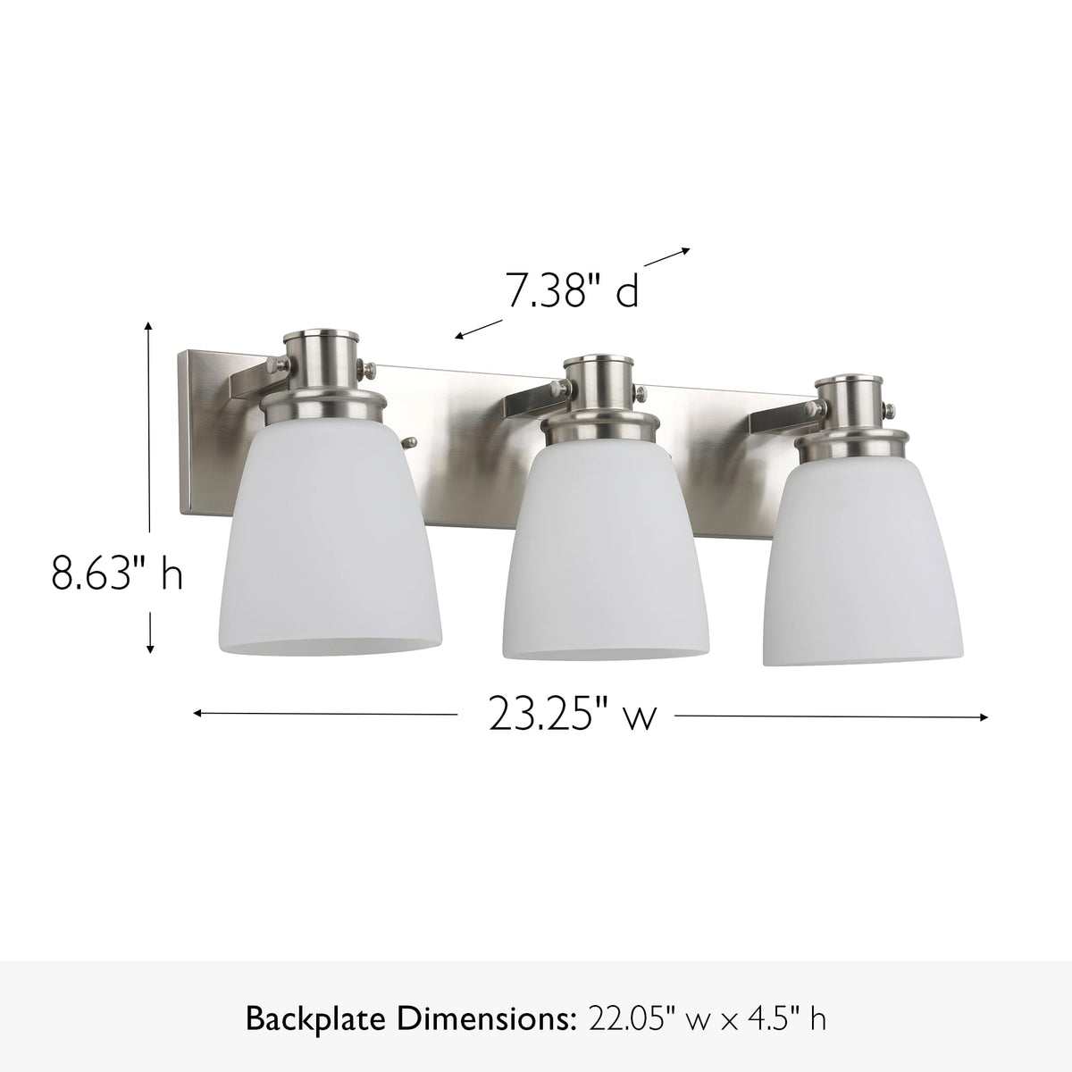 Enhance Your Bathroom With The Atkinson 23.3 In 3-Light Satin Nickel Traditional Vanity Light. Its Transitional Design Blends Timeless Style With Modern Updates, While Frosted Shades Provide A Glare-Free Glow Ideal For Grooming Or Relaxing. This Fixture Can Be Mounted With Lights Facing Up For Ambiance Or Down For Task Lighting. Pair With A Compatible Dimmer Switch (Not Included) For Adjustable Brightness. Includes Mounting Gear For Easy Installation And Simple Bulb Access. Measuring 23.3 In L X 7.4 In W X 8.6 In H, It Suits Both Single And Double Vanities. The Satin Nickel Finish Complements Most Bathroom Hardware, And The Durable Construction Ensures Lasting Performance.