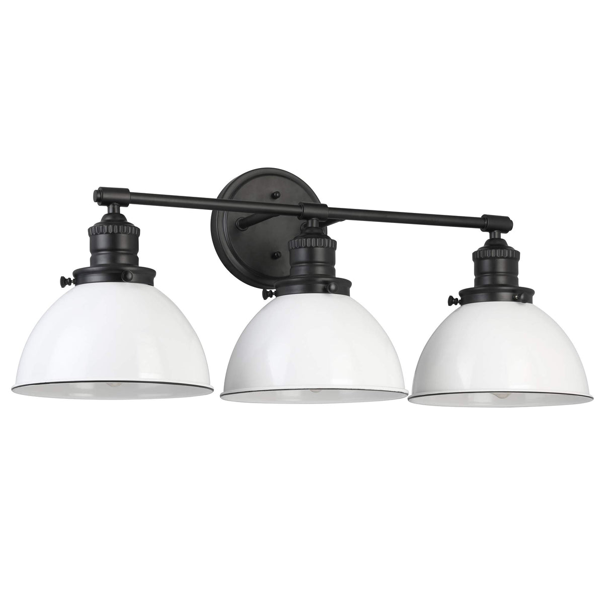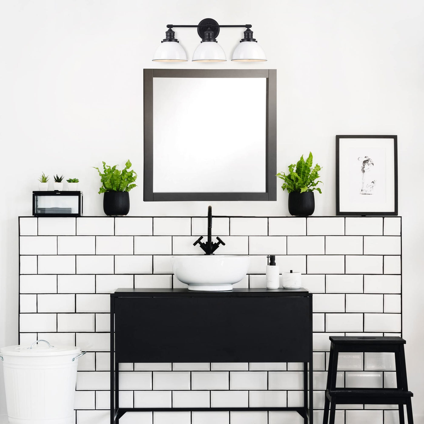 The Design House Savannah 3-Light Vanity Light combines rustic and modern farmhouse styles, featuring white metal shades with subtle black trim and a contemporary matte black finish. This versatile downlight fixture adds a touch of simplistic charm to bathrooms, bedrooms, and entryways. Constructed from high-quality steel, it offers durability and timeless appeal. Measuring 10.88 inches in height, 26 inches in length, and 9 inches in depth, the vanity light is designed to fit above mirrors, providing ample illumination. It requires three 60-watt medium base bulbs or LED equivalents (bulbs not included) and is fully dimmable when used with a compatible dimmer switch (sold separately). This product is UL Listed for use in damp locations. Backed by a 10-year limited warranty, Design House ensures quality lighting solutions that enhance your home decor.