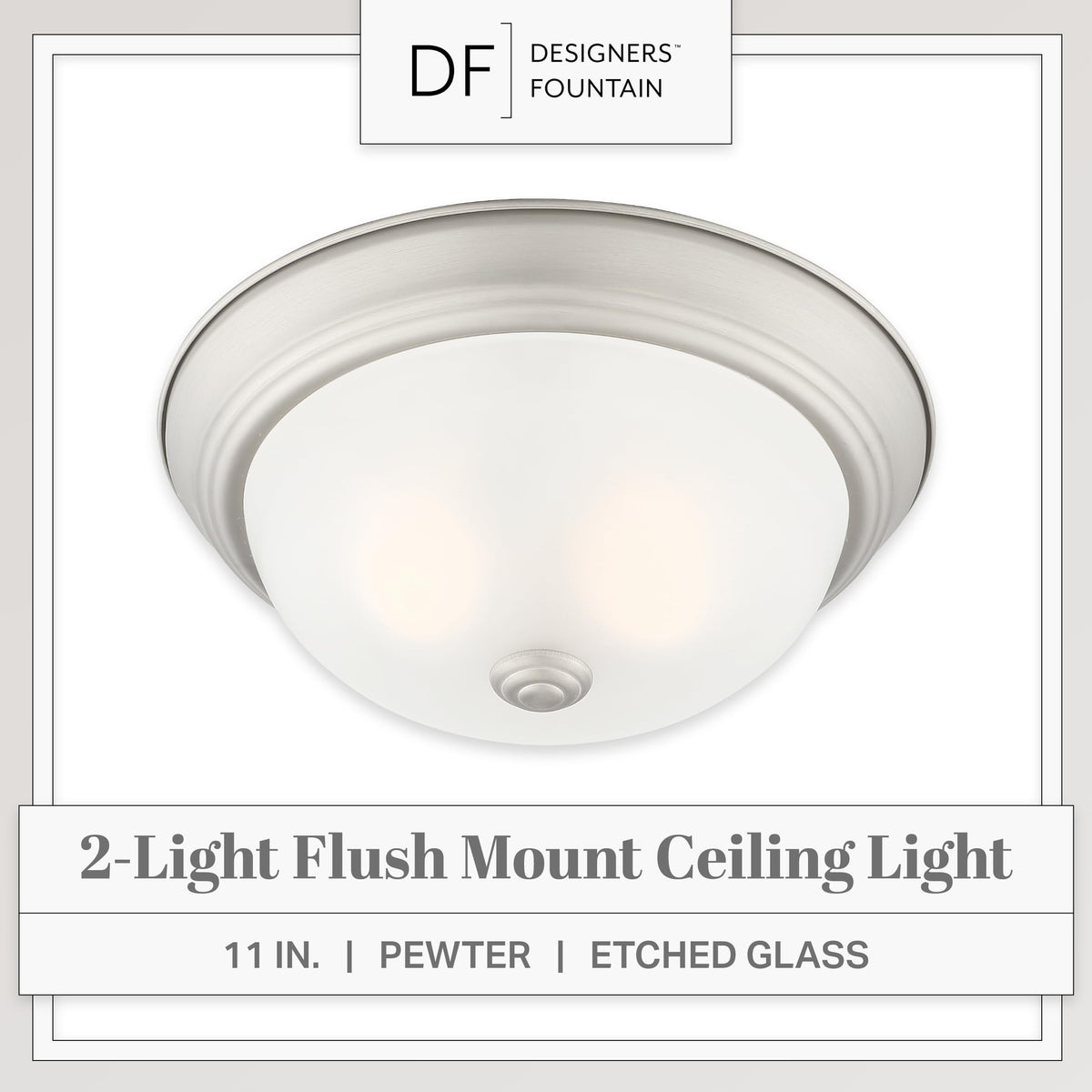 Designers Fountain 2-Light Flush Mount Ceiling Light, 11 Inch Lighting Fixture For Kitchen, Bedroom, Bathroom, And Hallway, Pewter With Etched Glass, 1257S-Pw-W