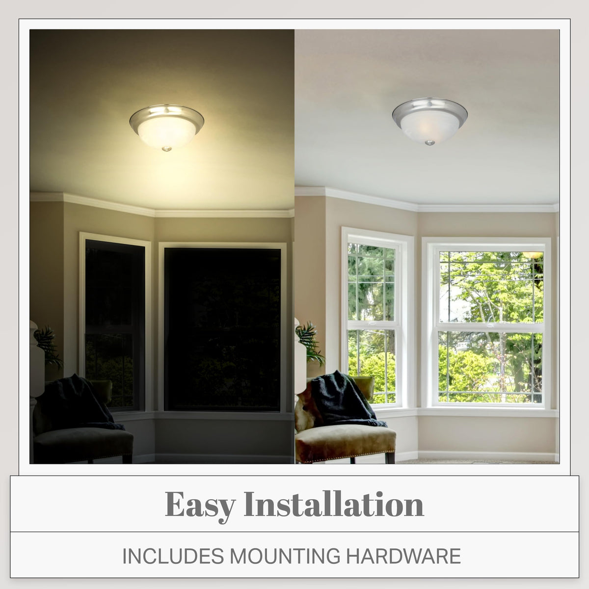 Add bright interior illumination and a touch of elegance to your home with our DESIGNERS FOUNTAIN ceiling mounted light fixture. Constructed with durable long-lasting steel and sleek white alabaster glass, this ceiling mounted light fixture cover is great for adding a touch of class and sophistication to your home decor, and is perfect for use in bathrooms, bedrooms, stairwells, hall ways, utility rooms, or even the entrance to your home. This interior light fixture includes the necessary mounting hardware to allow for easy installation onto ceilings, and the flushed ceiling light also allows for easy bulb replacement. Our simple light fixture measures 13.25 W x 13.25 D x 5.25 H in inches, and is suitable for use with two 60W LED or incandescent bulbs (Bulbs not included). This round ceiling light is UL/cUL and damp location rated, and backed by a 1 year warranty. Enhance your home's lighting with this elegant and contemporary light fixture.