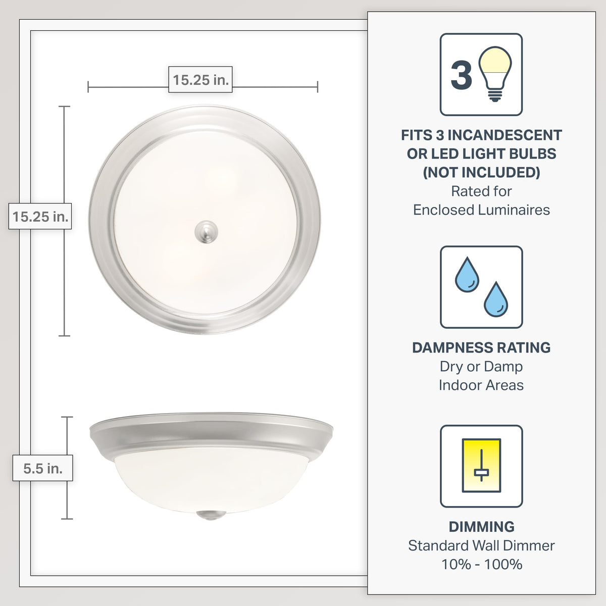 Add bright interior illumination and a touch of elegance to your home with our DESIGNERS FOUNTAIN ceiling mounted light fixture. Constructed with durable long-lasting steel and sleek etched glass, this ceiling mounted light fixture cover is great for adding a touch of class and sophistication to your home decor, and is perfect for use in bathrooms, bedrooms, stairwells, hall ways, utility rooms, or even the entrance to your home. This interior light fixture includes the necessary mounting hardware to allow for easy installation onto ceilings, and the flushed ceiling light also allows for easy bulb replacement. Our simple light fixture measures 15.25 W x 15.25 D x 5.5 H in inches, and is suitable for use with three 60W LED or incandescent bulbs (Bulbs not included). This round ceiling light is cULus certified for use in damp indoor areas, and backed by a 1 year warranty. Enhance your home's lighting with this elegant and contemporary light fixture.
