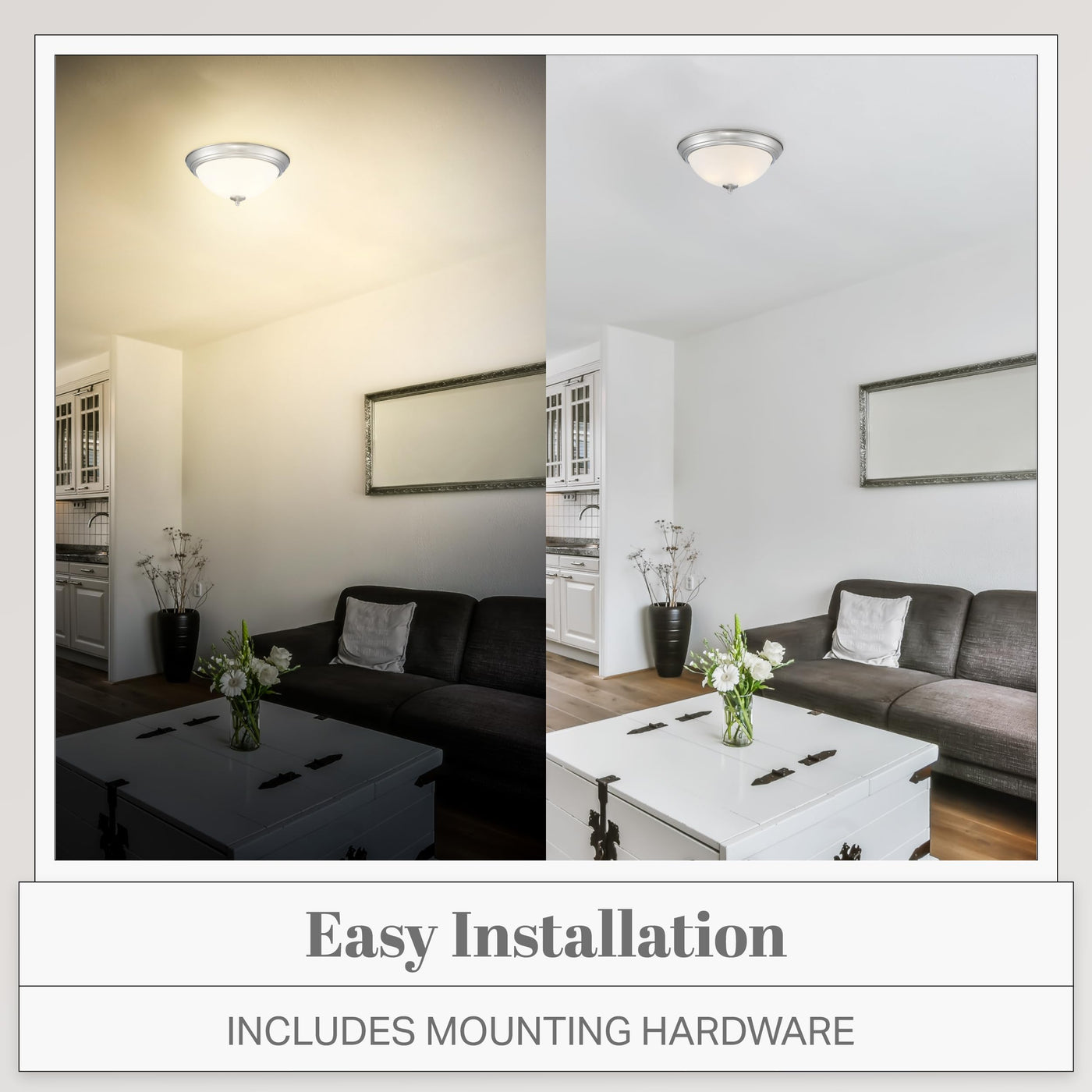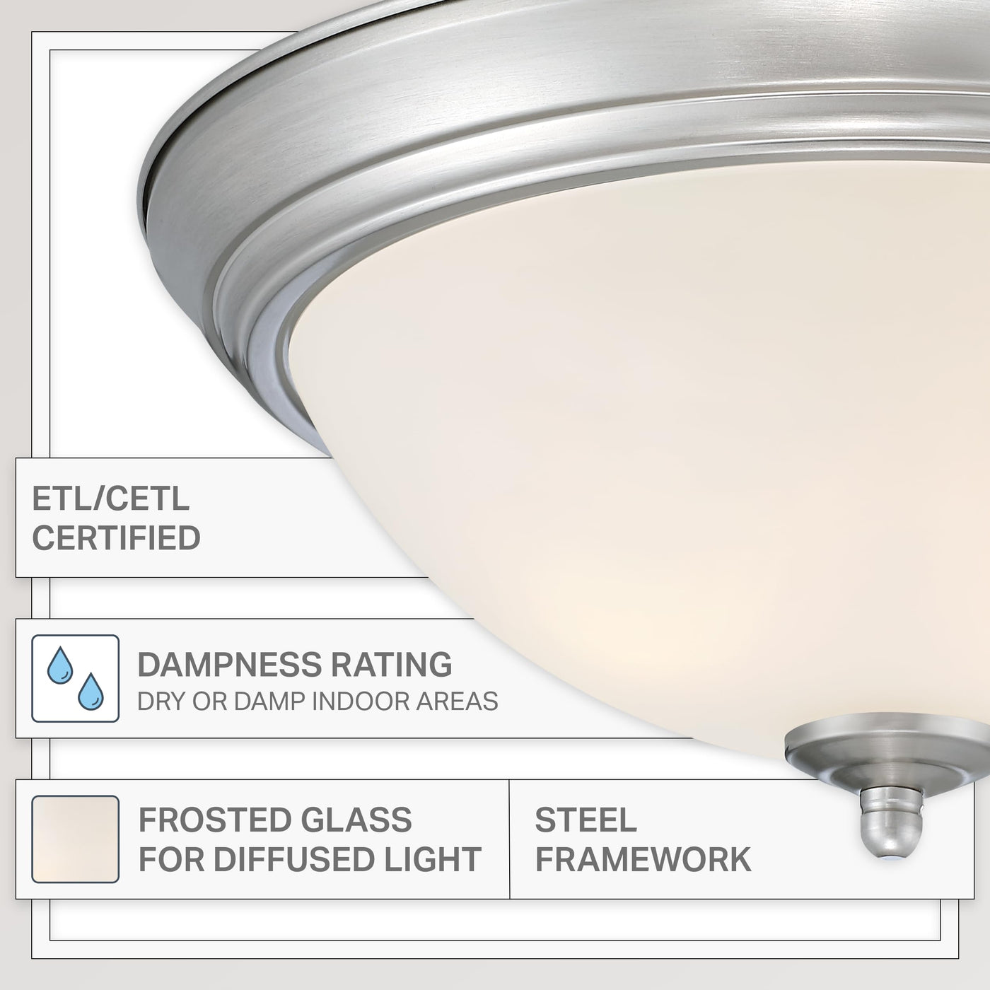 Add bright interior illumination and a touch of elegance to your home with our DESIGNERS FOUNTAIN dimmable LED ceiling mounted light fixture. Constructed with durable long-lasting steel and sleek frosted glass for a softer diffused light, this ceiling mounted light fixture is great for adding a touch of class and sophistication to your home decor, and is perfect for use in bathrooms, bedrooms, stairwells, hall ways, utility rooms, or even the entrance to your home. This interior light fixture includes the necessary mounting hardware to allow for easy installation onto ceilings, and the flushed ceiling light also allows for easy bulb replacement. Our simple light fixture measures 12.8 W x 12.8 D x 5.5 H in inches, and is suitable for use with two 15W LED bulbs (Bulbs not included). This round ceiling light is ETL/CETL listed, damp location rated, and fiber glass free. Enhance your home's lighting with this elegant and contemporary light fixture.