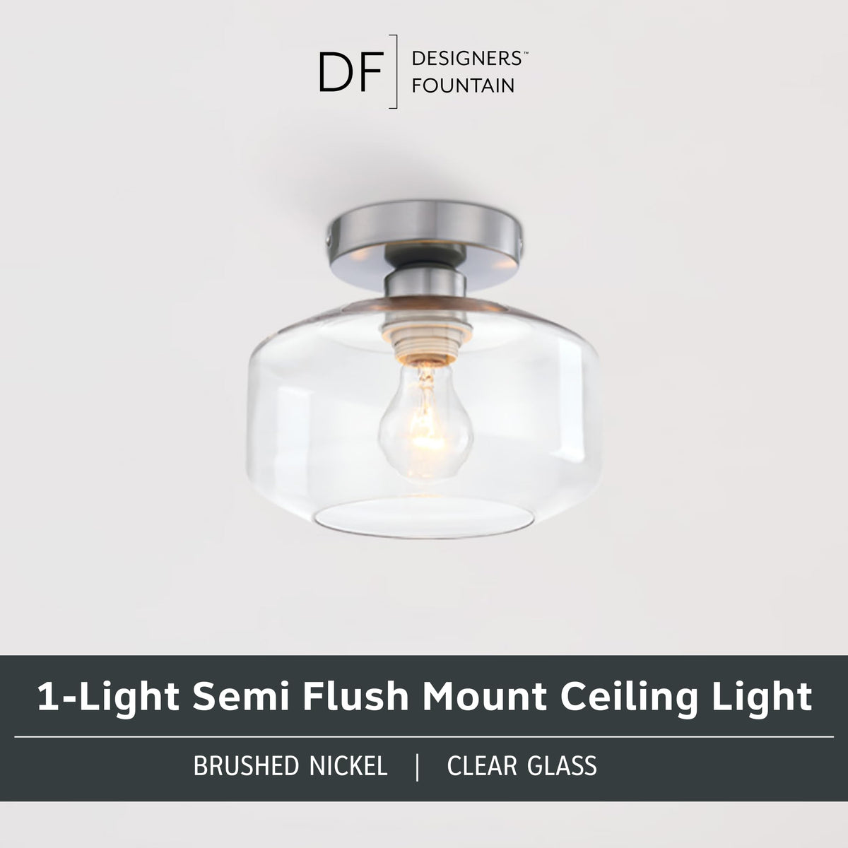Designers Fountain Semi Flush Mount Ceiling Light, 8.75 Inch Clear Glass Lighting Fixture For Kitchen, Bedroom, Bathroom, And Ha