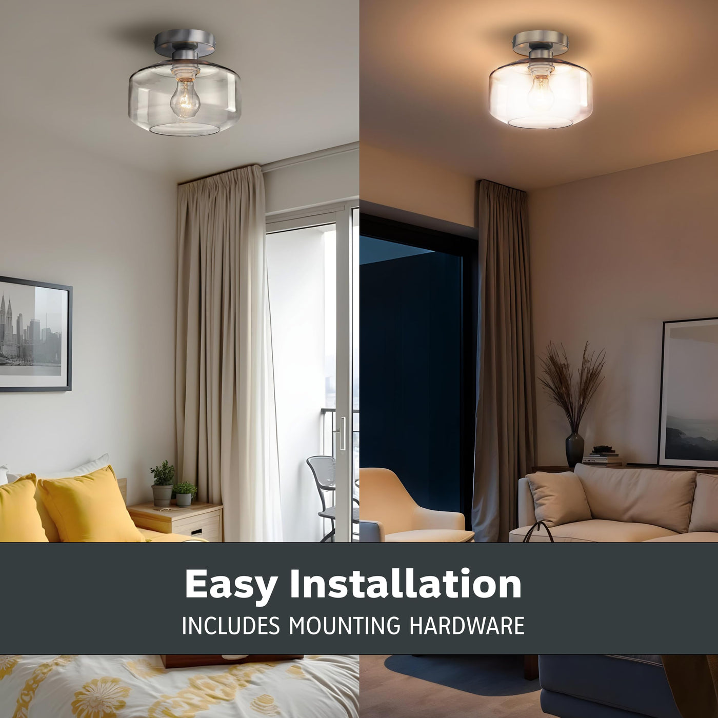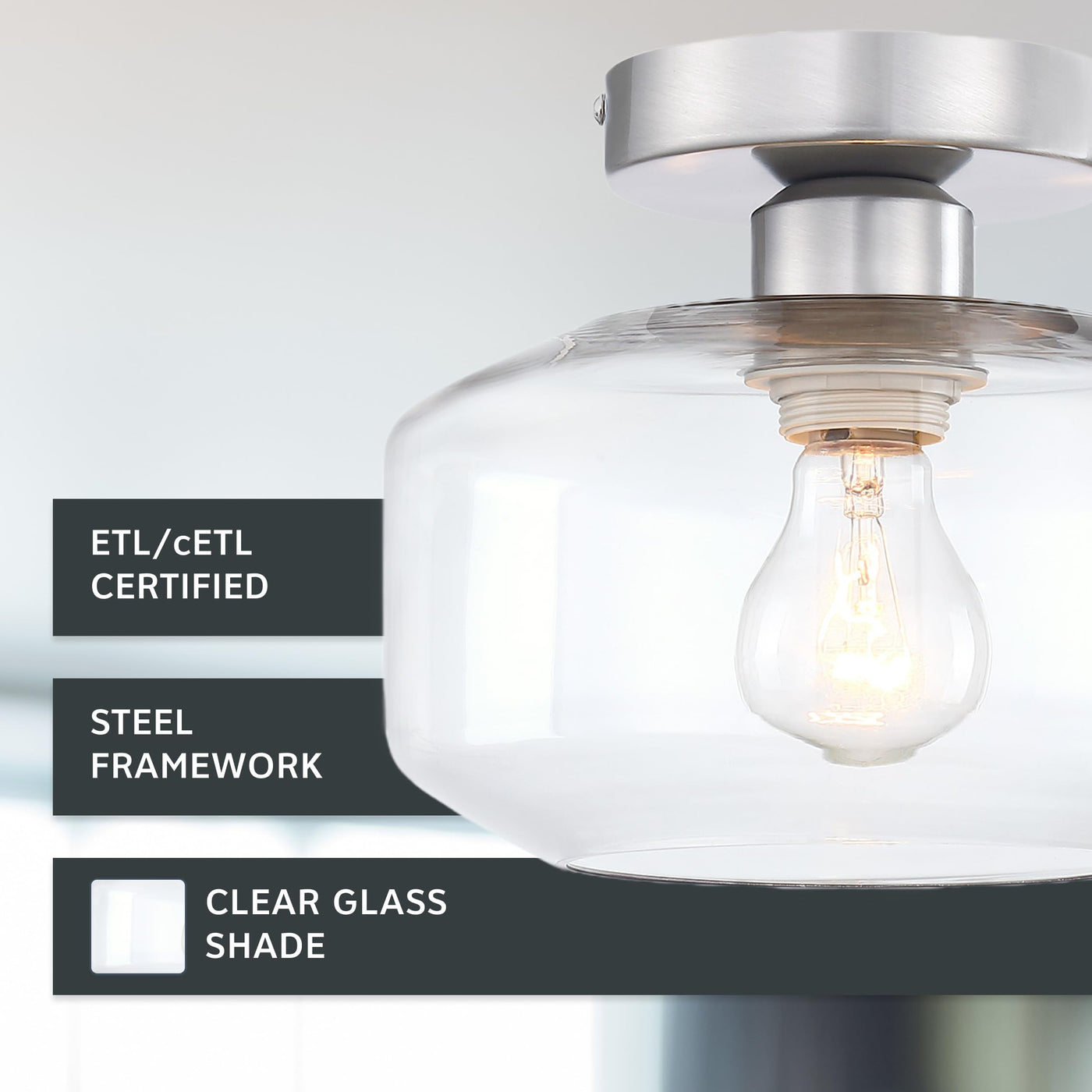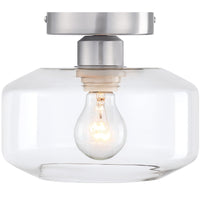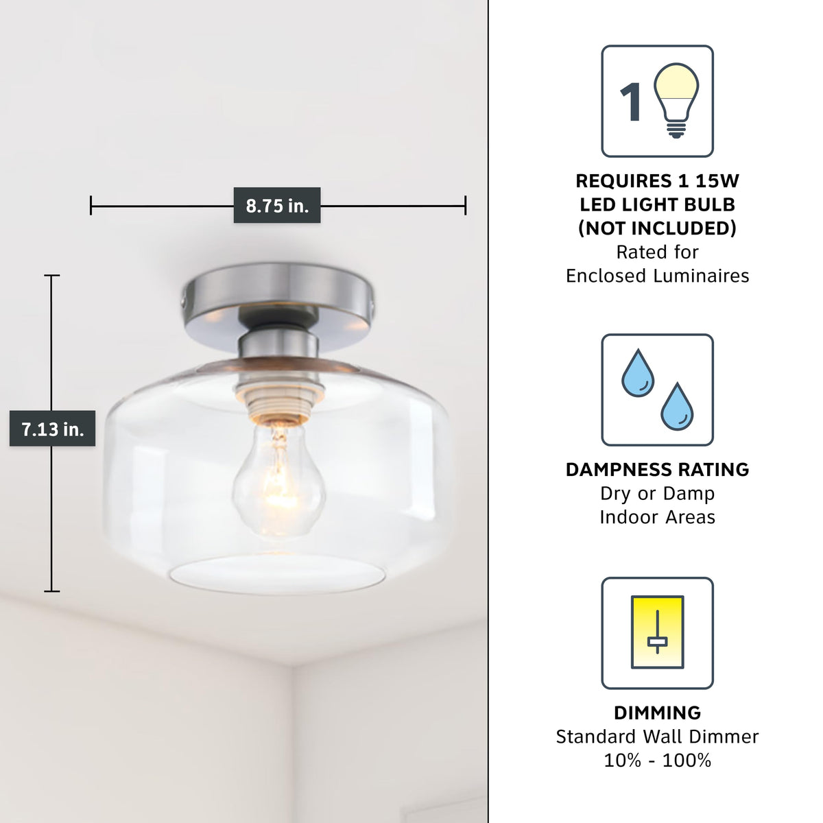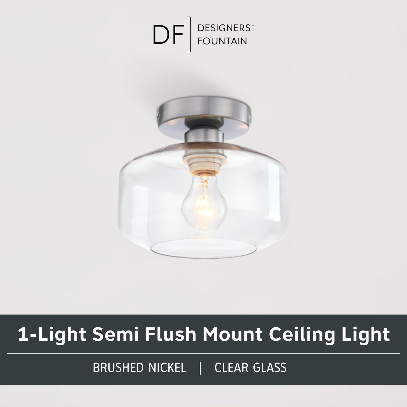 Add bright interior illumination and a touch of contemporary class and sophistication to your home with the DESIGNERS FOUNTAIN Semi Flush Mount Ceiling Light Fixture! Constructed with durable long-lasting steel and a clear glass shade for soft diffuse lighting, this ceiling mounted light fixture is a great for adding a touch of timeless elegance to your home decor, and is perfect for use in bathrooms, bedrooms, kitchens, hall ways, entryways, or anywhere else you want some overhead light. This interior light fixture includes the necessary mounting hardware to allow for easy installation onto ceilings, and the semi flushed ceiling light also allows for easy bulb replacement. Our simple light fixture measures 8.75 Inch Diameter x 7.13 H in inches, and is suitable for use with 1 medium based bulb 15 watts or less (Bulbs not included). This round ceiling light is ETL listed, damp location rated, and backed by a 1 year warranty. Enhance your home's lighting with this elegant and contemporary light fixture.