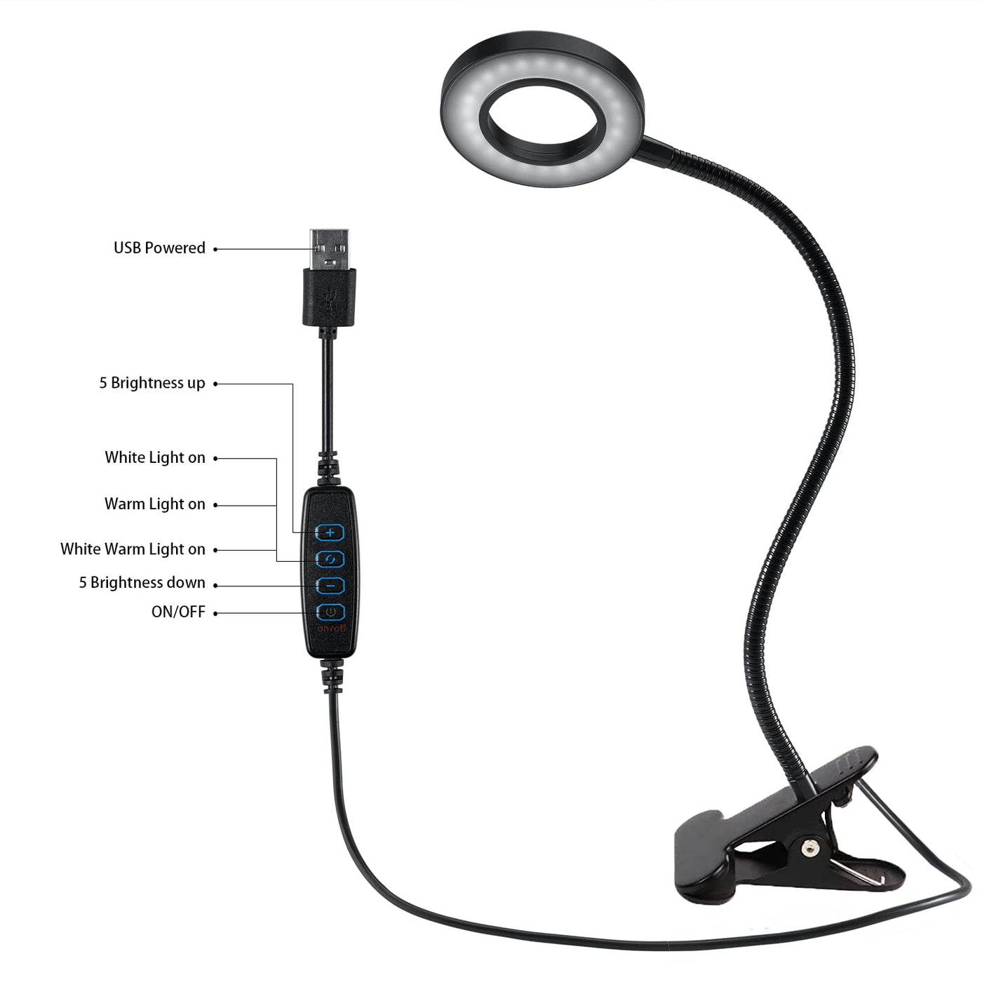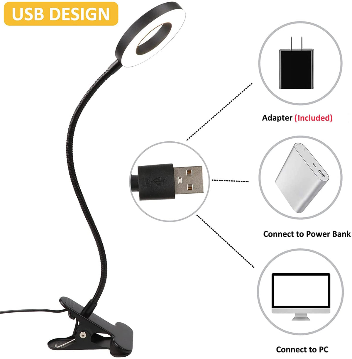 Simulates Natural Light: The round head clip light with 48 LED chips simulates the natural light diffuse reflection, reduce multiple shadows, no flicker, no dizzy light Designed to create a natural and soft light which wonAt strain your eyes even after long hours of use, perfect for your reading, working, travel, camping etc 3 color Temperatures and 10 Brightness Settings: Simply tap the switch button to switch from 3 color temperatures (warm light 3000K, warm-white light 4500K and white light 6500K)) and 10 brightness settings, satisfying your different lighting demands in daily life 360AAdjustable& Scratch-free clip: 40cm flexible gooseneck can rotate 360 help you easy to twist and select the light direction you need The metal clamp with foam pad design protect your furniture, attaches firmly to any bed headboard, table and edge ADAPTER INcLUDE:50inches USB cord help you easy to plug into any available USB port to power the lamp kindly reminder: Only Match with 5V 2A adapter clip lamp can remember the brightness and light mode of the last using Eco Friendly & Reliable Quality: The clip reading light could rapidly heat dissipation, ensures the wick is continuously stable and efficient, much longer life than the plastic radiator Please feel free to contact us if your product is faulty or damaged We will provide you with excellent after-sale service