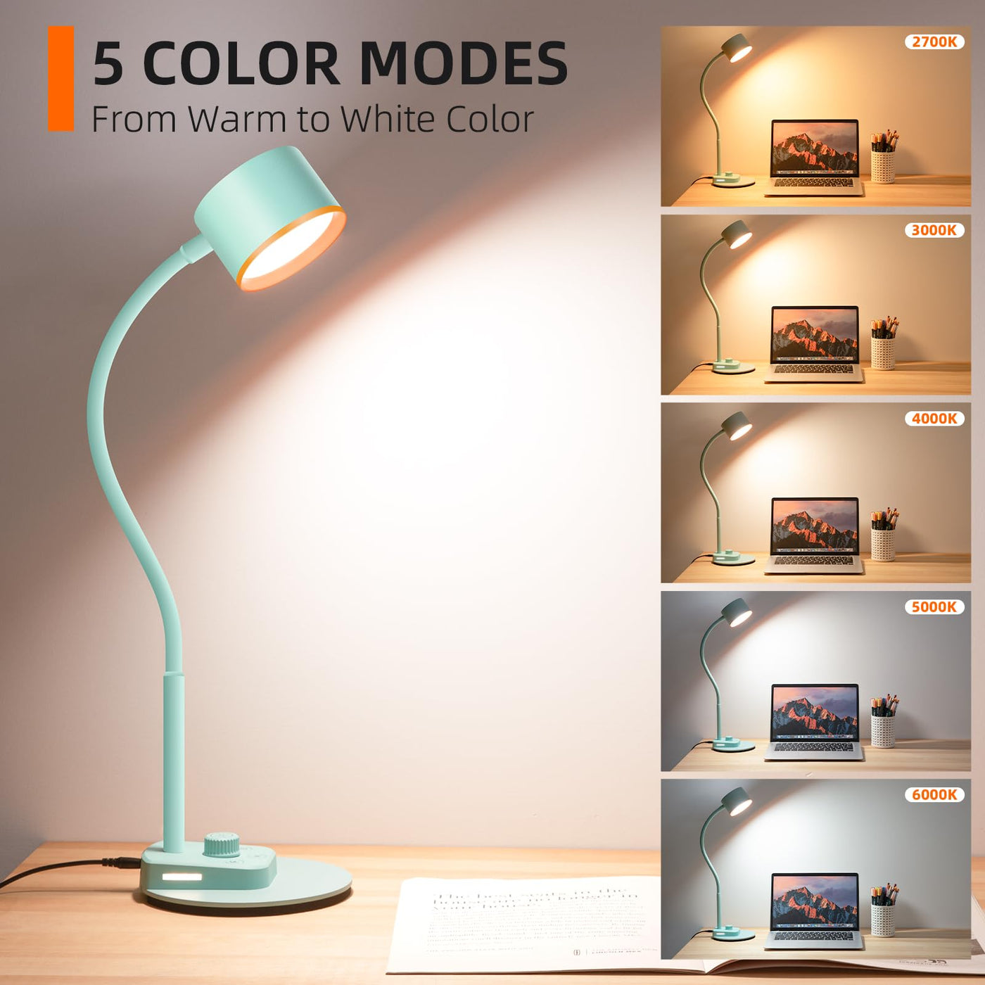 Q: What are the different color modes available for this desk lamp?A: The desk lamp features 5 color modes ranging from 2700K warm light to 6000K cold white light. Each mode serves a different purpose: 2700K for ambiance, 3000K for bedside reading, 4000K for simulating daylight, and 5000-6000K for work and design tasks.