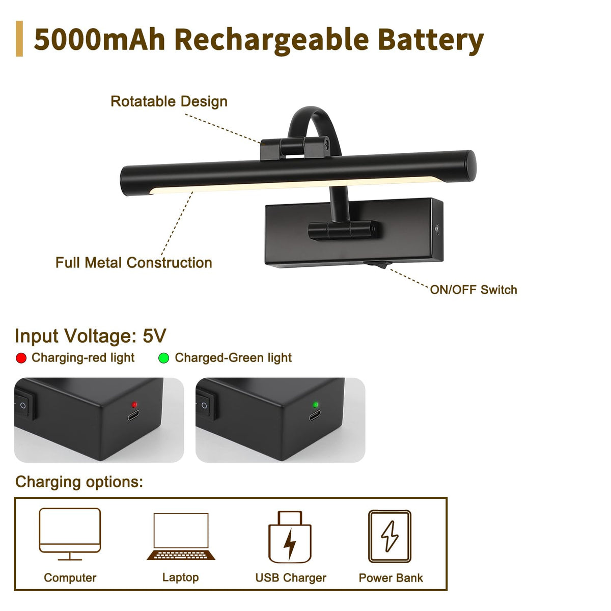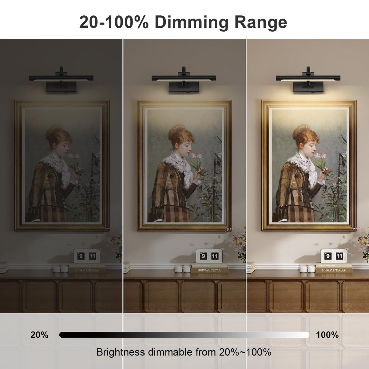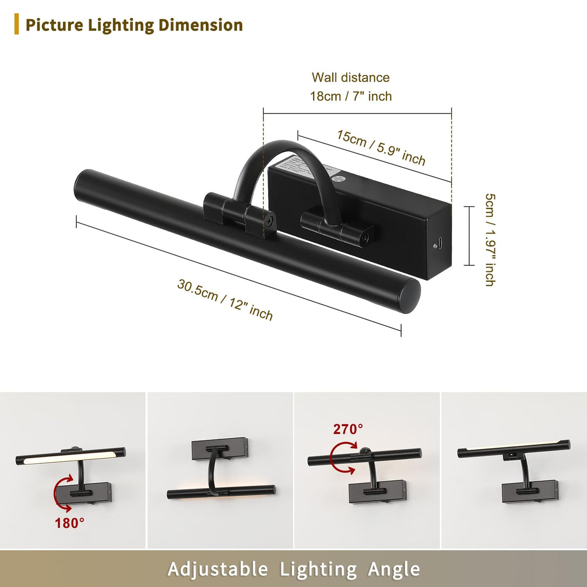 Wireless picture lights can be rechargeable and dimmable with the range of 10-100%. You can choose the brightness according to your personal needs. The art light offers 2700K warm white to warmly add elegance to your indoor decor. The rechargeable light can be easily mounted to wall with the accessories supplied. No need for replacing batteries or reserved wires. Battery picture lights can be automatically turned off in 0.5-4 hours. 270? rotatable lamp head allows the light easily disperse the light where you want. The battery operated light is a fabulous addition to your artwork, family portraits, gallery and so on.