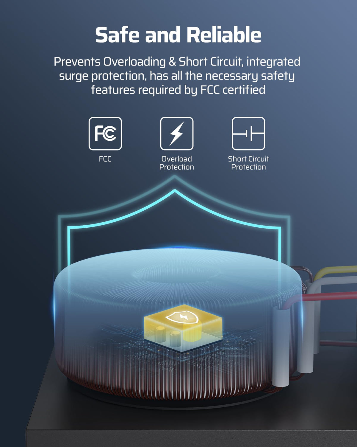 Q: What safety features does the transformer include?A: The transformer includes overload protection and a memory function. It automatically cuts power when the current exceeds the threshold, protecting your devices. Additionally, it stores data on a cloud server, ensuring that your settings are retained even during power or internet outages.