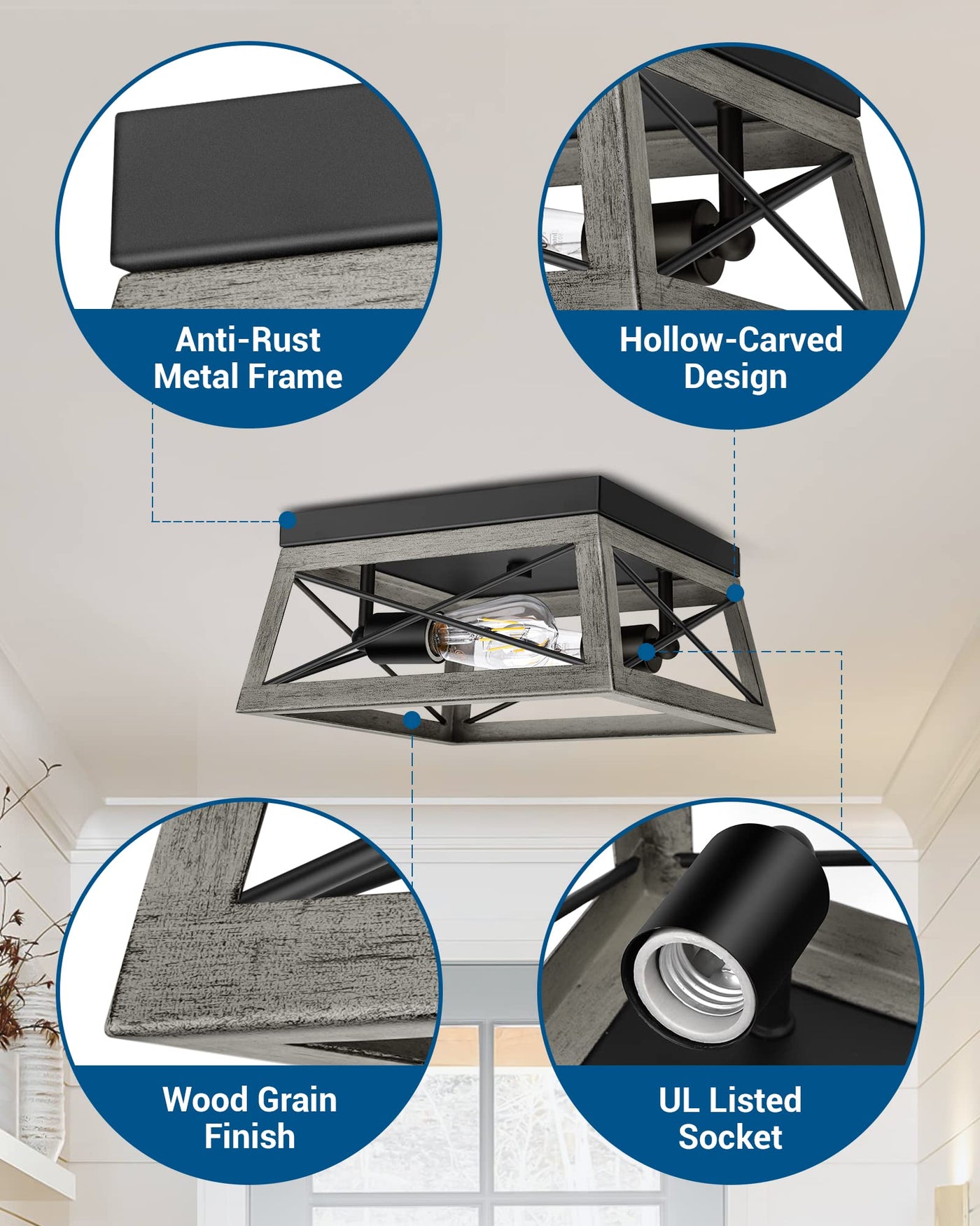 Crafted with a sturdy anti-rusted metal frame, this ceiling light features a rustic wooden grain finish that enhances its farmhouse aesthetic. The open-caged design not only adds a stylish touch but also allows for easy cleaning and maintenance. This fixture accommodates two E26 base bulbs (not included), providing ample light for any room. The durable construction ensures that this light will stand the test of time, making it a practical choice for everyday use.