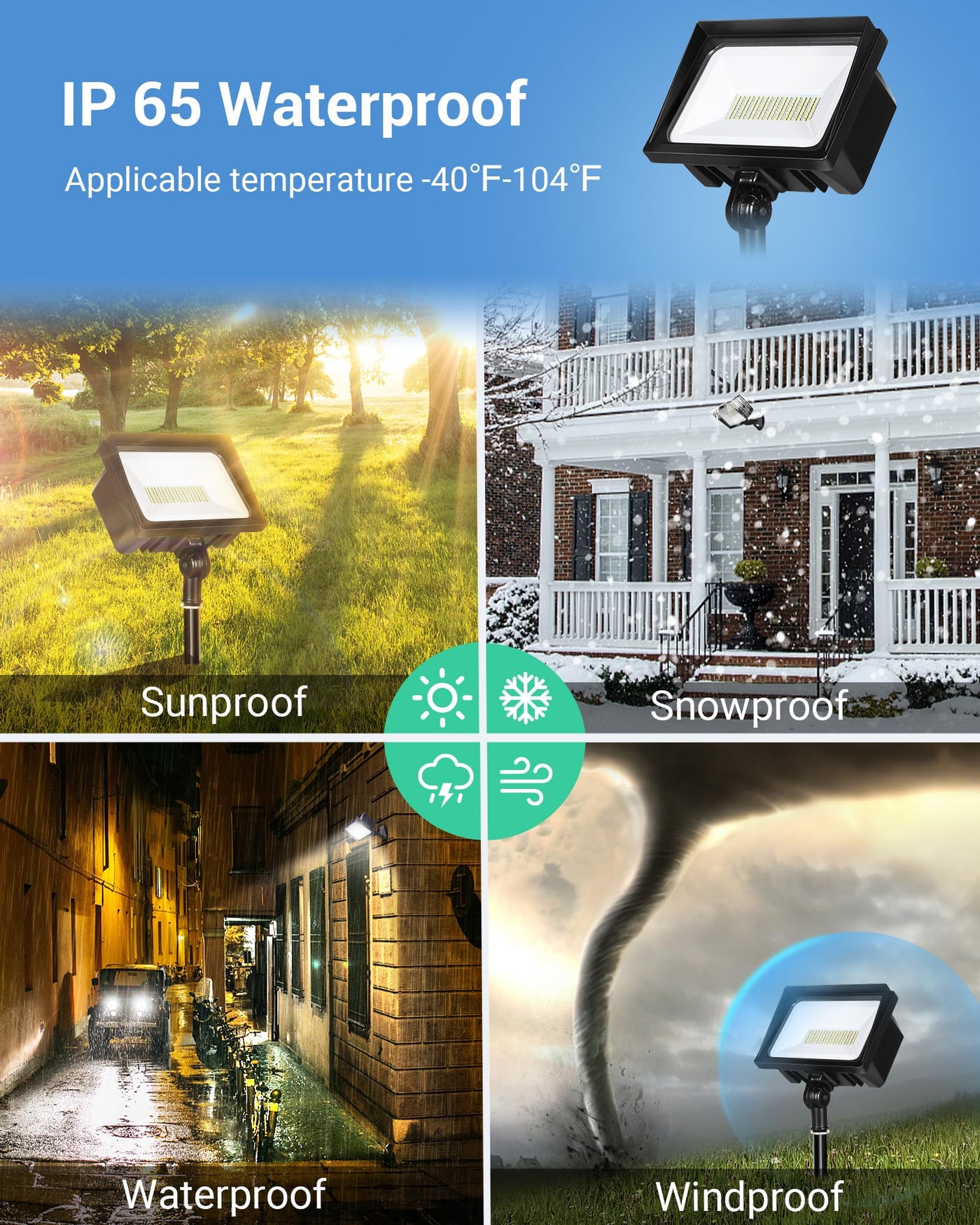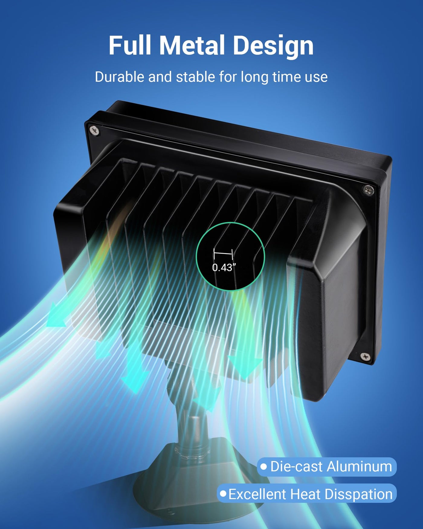 Q: What materials are used in the DEWENWILS flood light construction?A: The DEWENWILS flood light is made from durable die-cast aluminum, which provides excellent heat dissipation and prevents water leakage, ensuring a long lifespan of up to 60,000 hours.