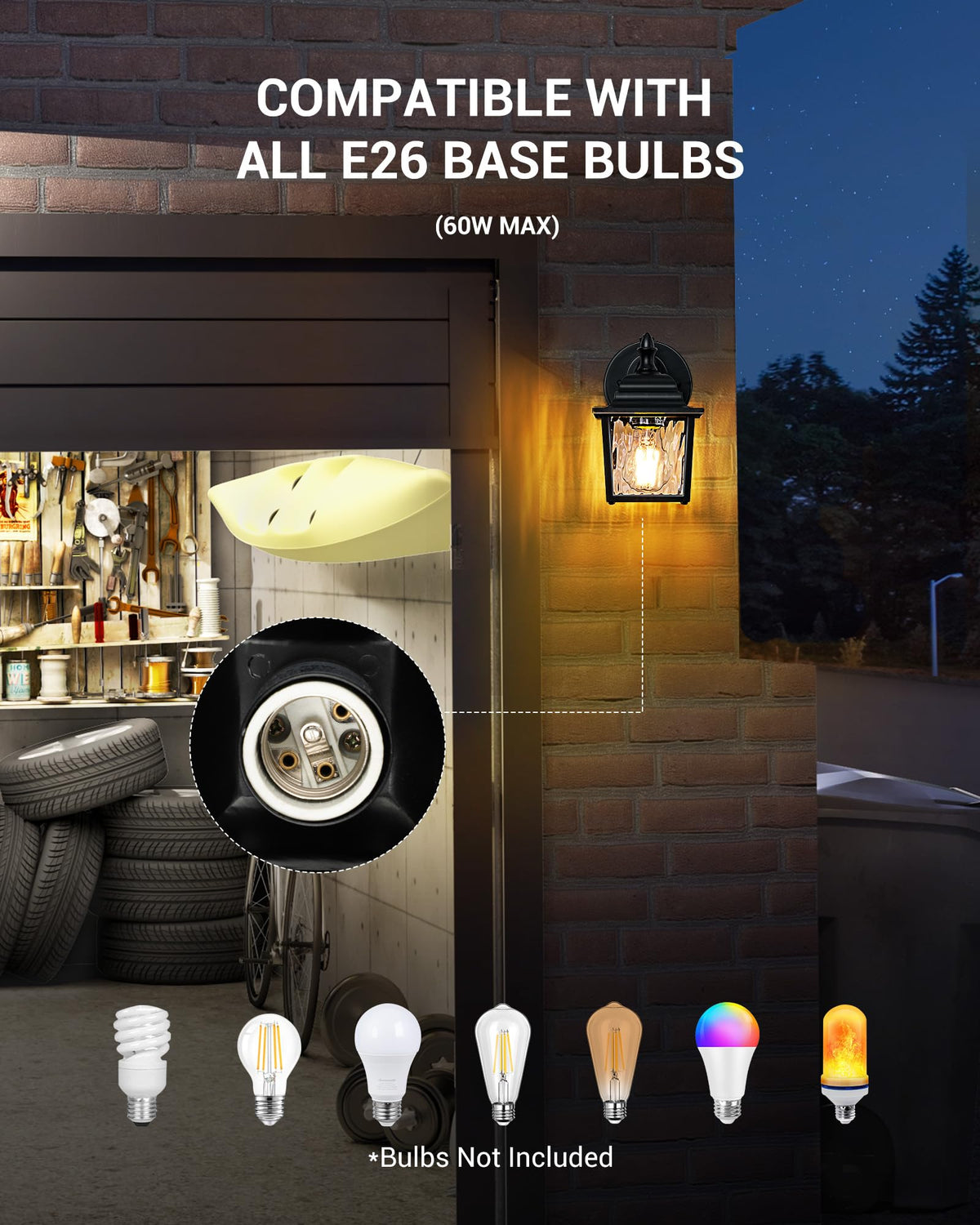 Q: What type of bulbs are compatible with this outdoor wall light?A: This outdoor wall light is compatible with E26 base bulbs, including LED, CFL, incandescent, and halogen bulbs, with a maximum wattage of 60 watts. Note that bulbs are sold separately.