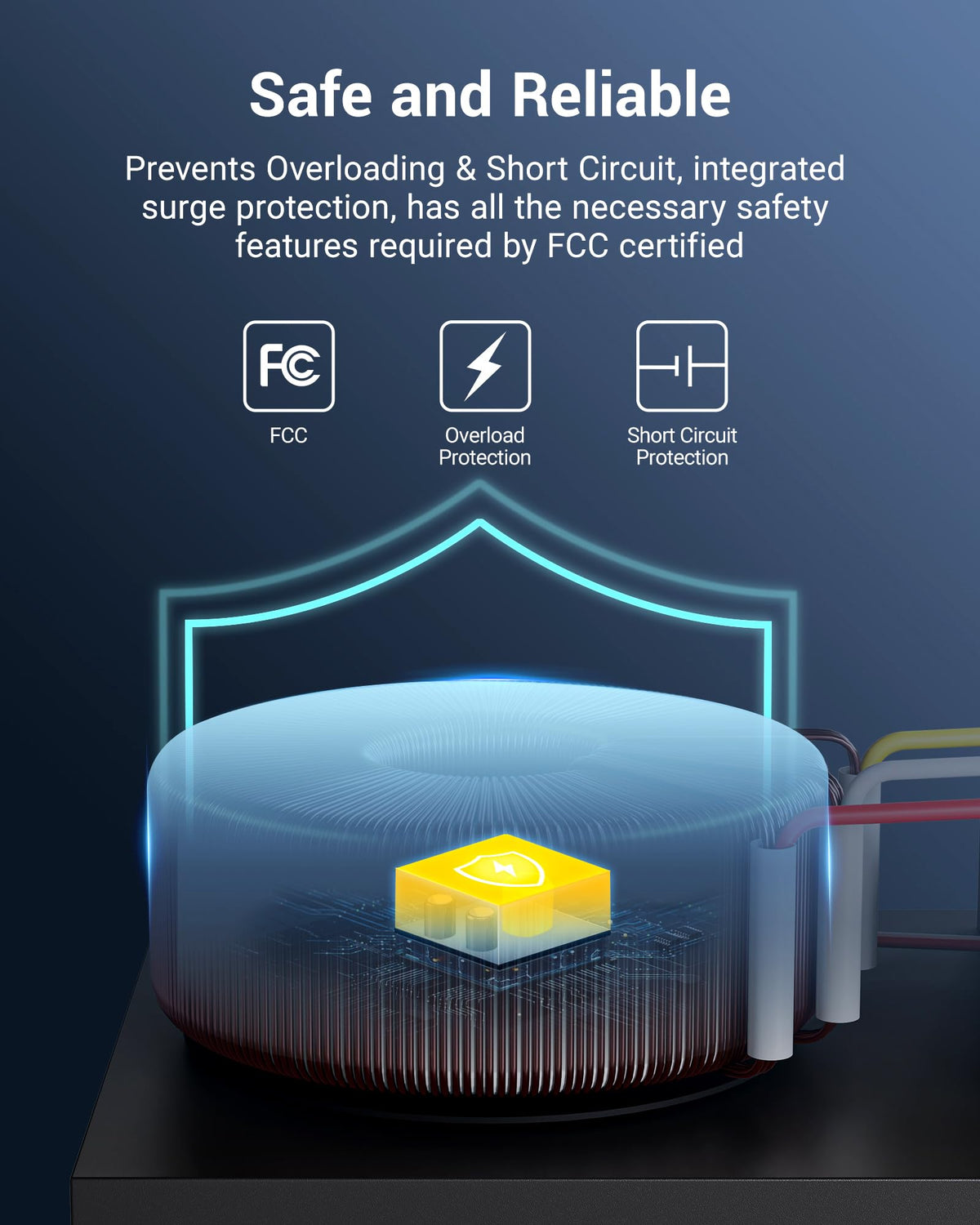 Q: What safety features does this landscape transformer offer?A: This transformer includes overload protection that automatically disconnects when the current exceeds the threshold, ensuring the safety of your plugged-in devices and protecting your landscape lights.