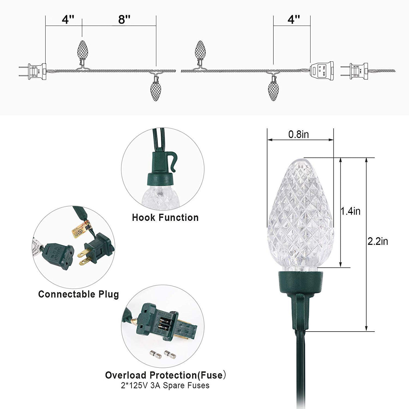 Decorative Lights Multi-Colored Led Bulbs, 50 Counts, Bright Enough, Up To 90% Energy Saving. Great Decoration For Home, Christmas Trees, Bushes, Patio, Eaves, Garden, Lawn, Backyard, Gate, And Porch By Hanging The String Lights Securely With The Convenient Hooks. It Can Create A Cheerful Atmosphere For A Party, Wedding, And Holidays, Festival Celebration. Connectable &Amp; Safe &Amp; Durable This Led Fairy String Lights Have An Overload Protection (Replaceable Fuse Plug). You Can Connect Up To 45 Strings Of The Same Set By End-To-End Or Attach Other Decorative Lights Up To 216 Watts In Total. Ul Listed, Ip44 Waterproof ,Safe For Indoor And Outdoor Use; Selected Pvc Material For Insulation, Flexibility, And Heat/Cold Resistance; Easy To Use And Retract. Specifications: - Bulb Quantity: 50 Pcs - Bulb Spacing: 8'' (20 Cm) - Lead Length: 0.67 Ft - Lighted Length: 32.63Ft - Total Length: 33.3Ft - Input Voltage: 120Vac 60Hz Packing List: 1 X 50 Led C7 Strings Lights 2 X Replacement Fuses 1 X Instruction Manual Note: The Max Connectable Wattage Is 216W, Please Know The Wattage Of Other Decorative Outfits Before Connection. Do Not Overload During Use