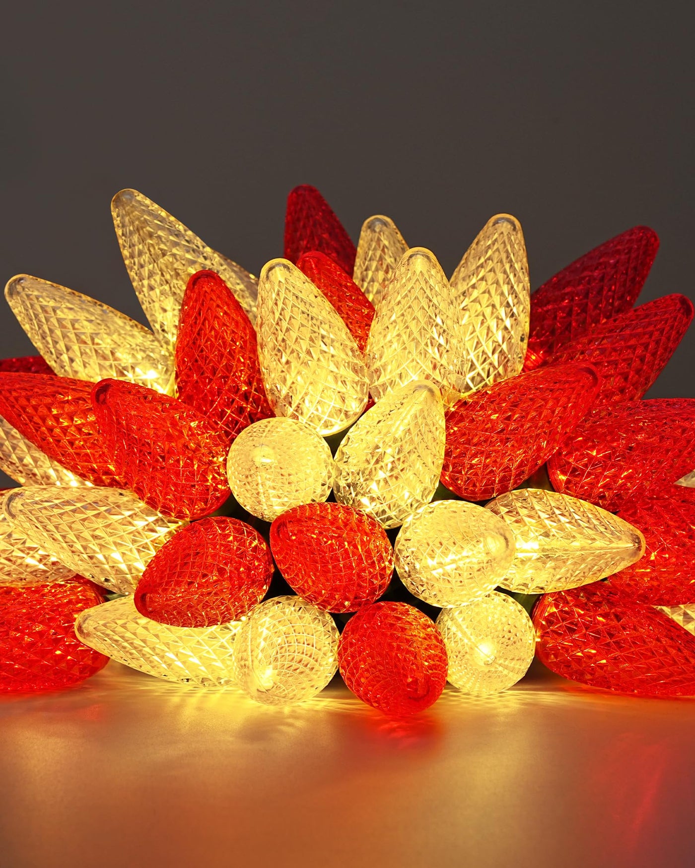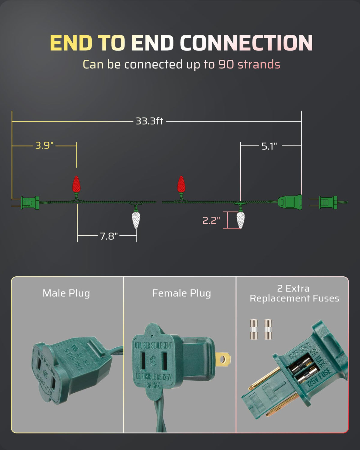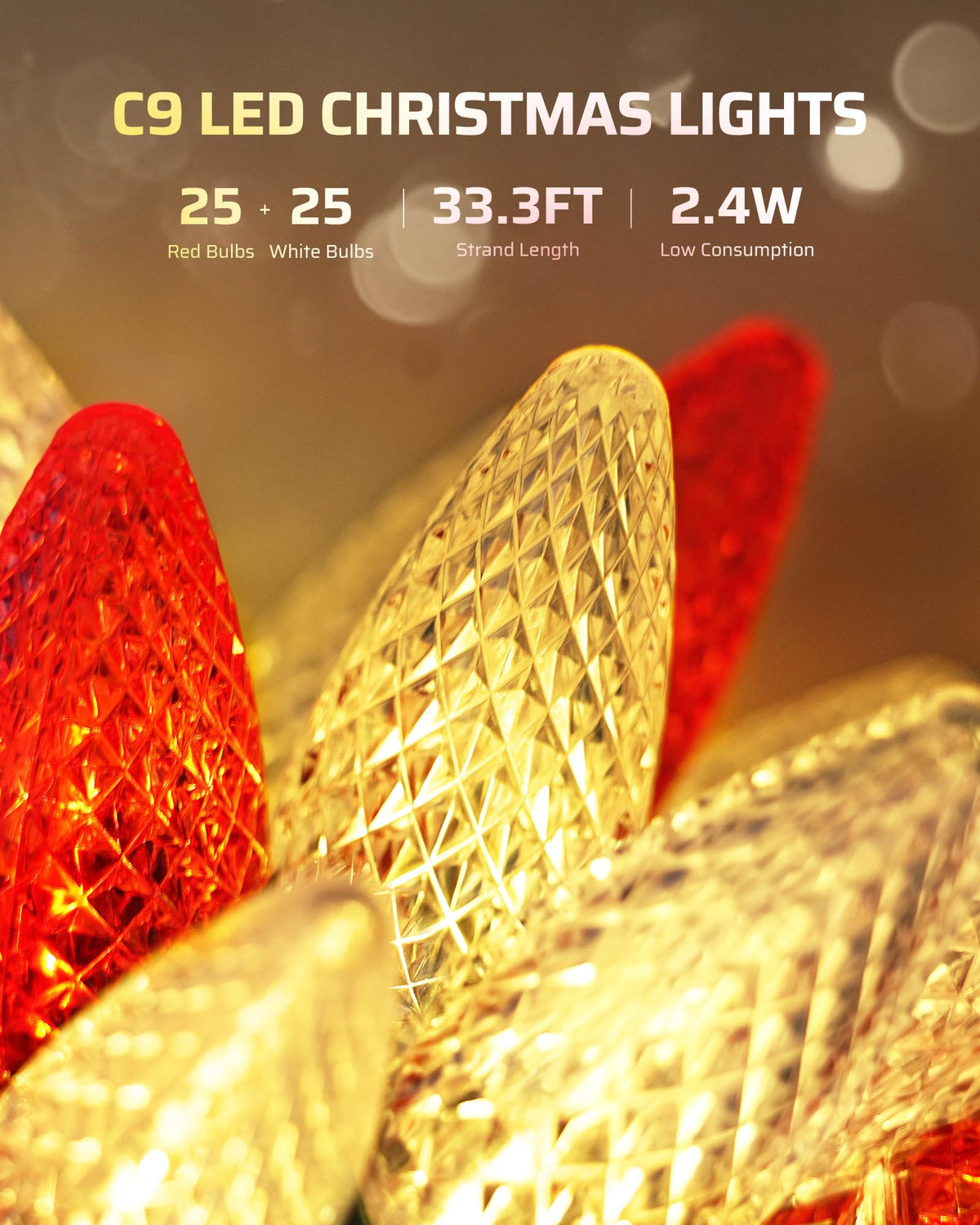 Q: How energy efficient are these LED Christmas lights?A: These C9 LED Christmas lights are highly energy efficient, consuming only 2.4W in total, which is approximately 0.05 watts per bulb. This results in 90% less energy consumption compared to traditional incandescent bulbs, making them a cost-effective choice for your holiday decorations.