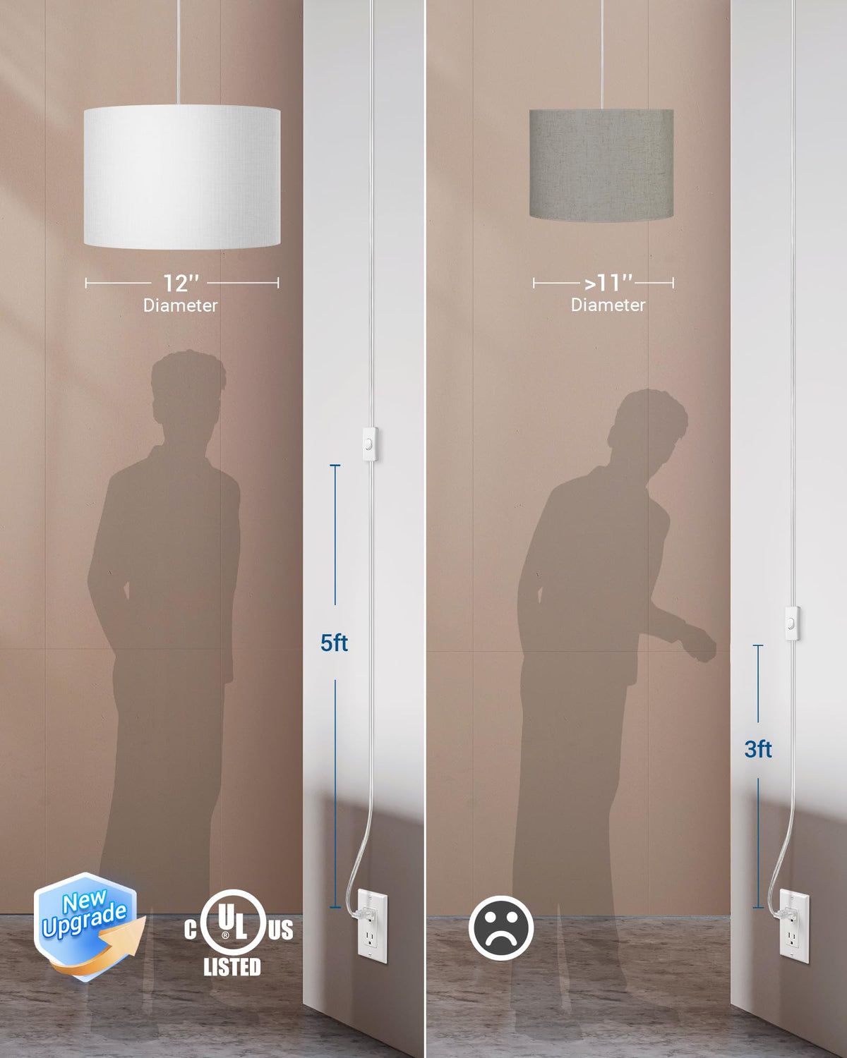 Blending With All Decor Styles You Can Place This Fixture Anywhere In Your Home. The Long Cord Allows To Adjust The Hanging Length And Position Without Worrying Where Your Wall Socket Is Placed. When You Need A Light To Illuminate Your Love Home, When You Need A Light That Can Be Disassembled And Styled At Any Time, Why Not Choose Dewenwils Plug In Pendant, Lighting Up Any Living Space. Packing List: -1 X Plug In Pendant -2 X Ceiling Hooks -2X Wall Anchor -2 X Cord Clip -1 X User Manual Specifications -Input Voltage: 120Vac 60Hz -Max. Load Power: Incandescent Bulb 60W -Socket Type: Standard Medium E26
