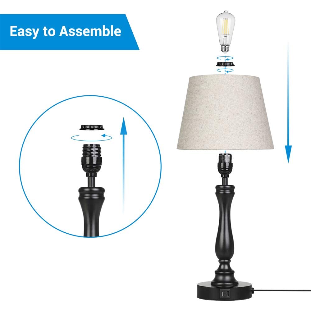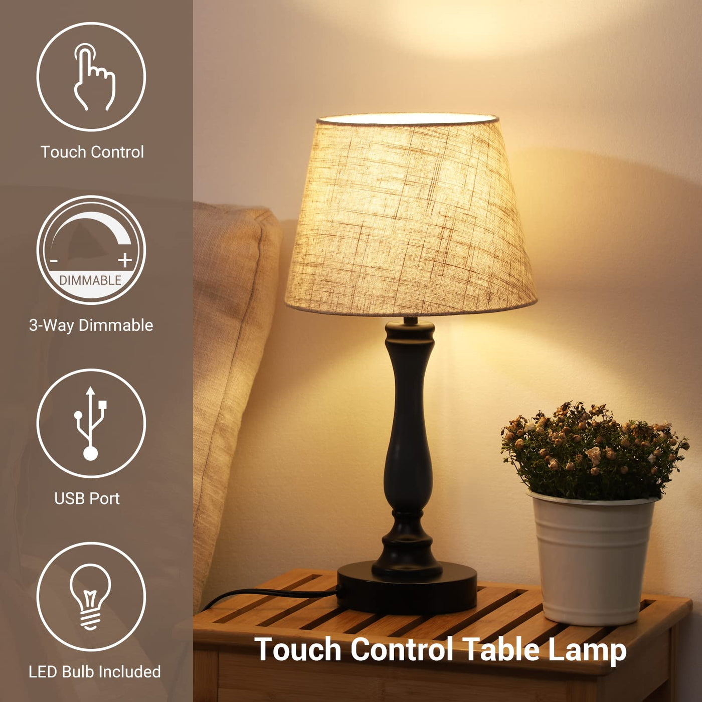 DEWENWILS Modern Bedside Table Lamp, 3-Way Dimmable Touch Control Desk Lamp with 2 USB Ports, Vintage Rustic Wood Nightstand Lam