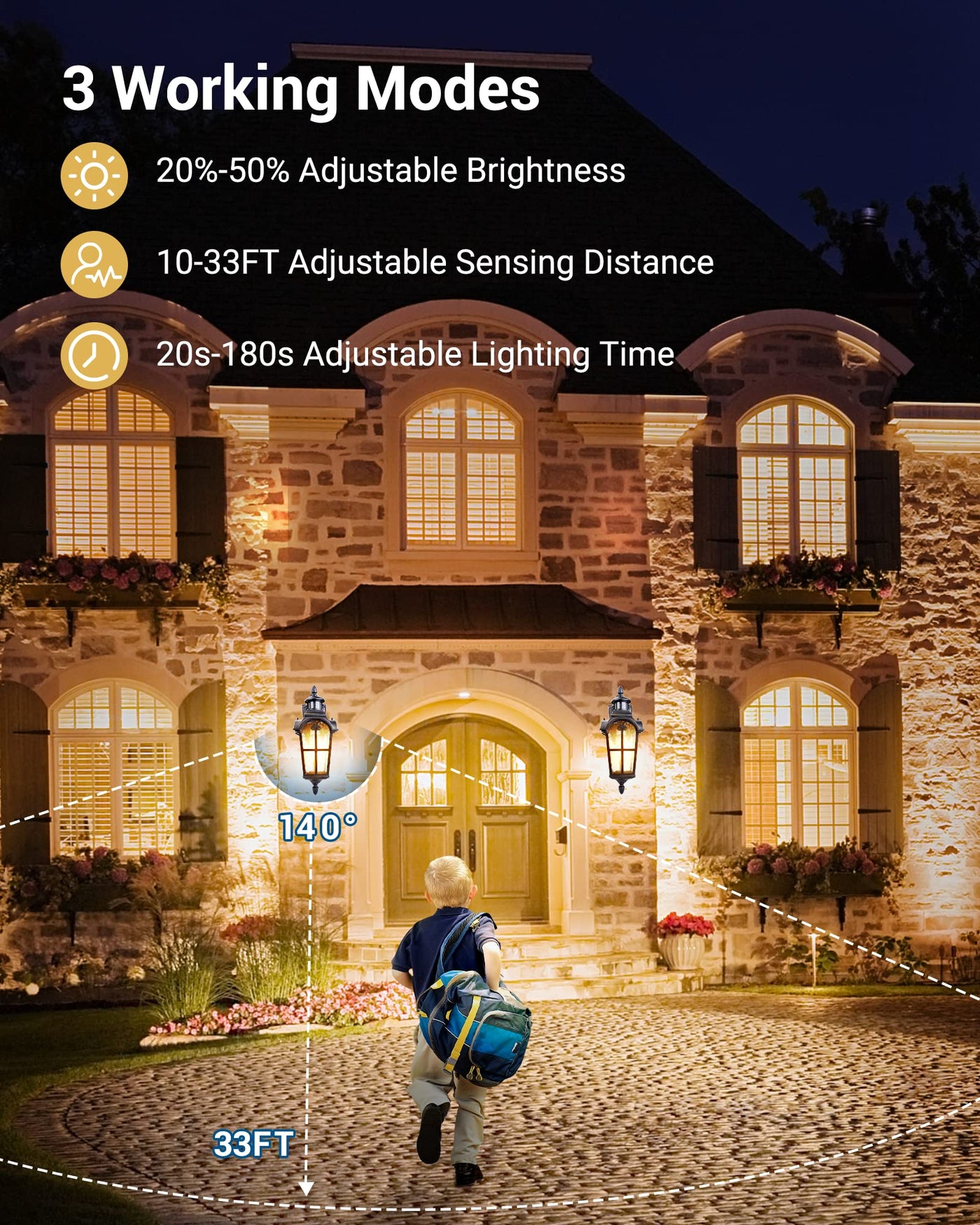 Q: How does the motion sensor work in these wall lights?A: The advanced PIR motion sensor in these wall lights has a 140-degree sensing angle and a detection range of 10-33 feet. It is designed to activate the light when it detects motion, such as people or cars, ensuring your outdoor areas are well-lit and secure.