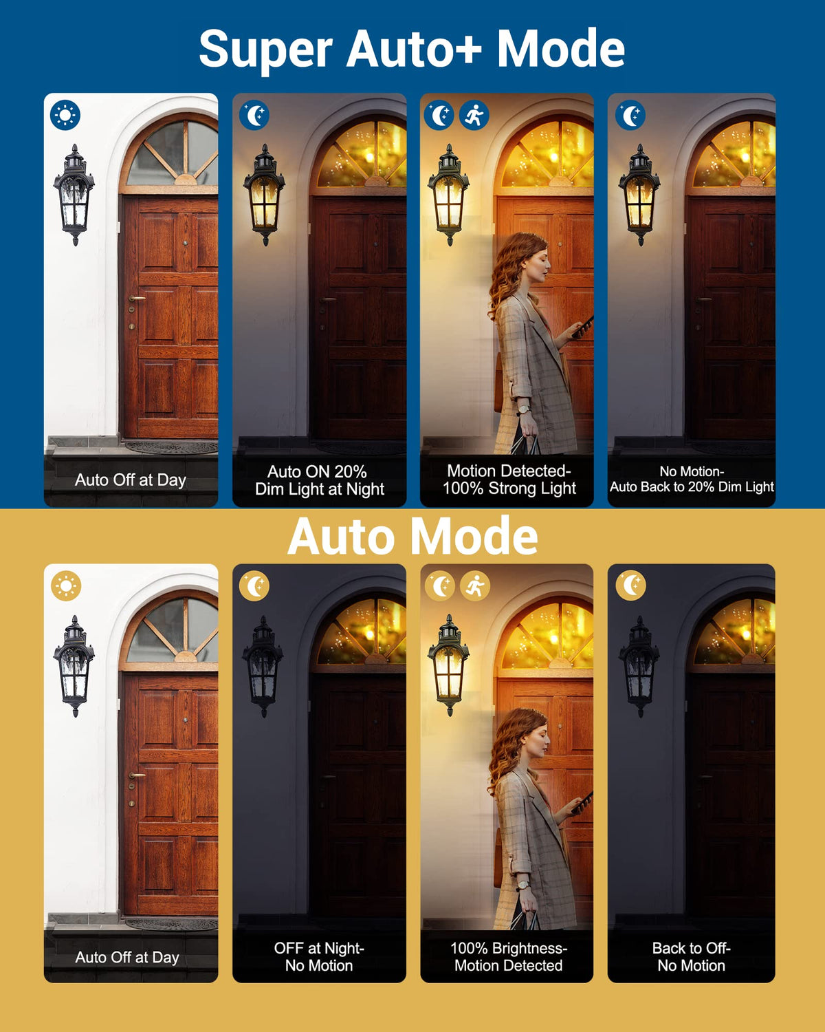 Q: What are the different modes of the DEWENWILS Motion Sensor Outdoor Wall Lights?A: The DEWENWILS Motion Sensor Outdoor Wall Lights feature three modes: Auto+ mode, which maintains a low brightness of 20% at night and switches to 100% brightness when motion is detected; Auto mode, which keeps the light off until motion is detected and then turns on at full brightness; and PC mode, which automatically turns on at dusk and off at dawn.