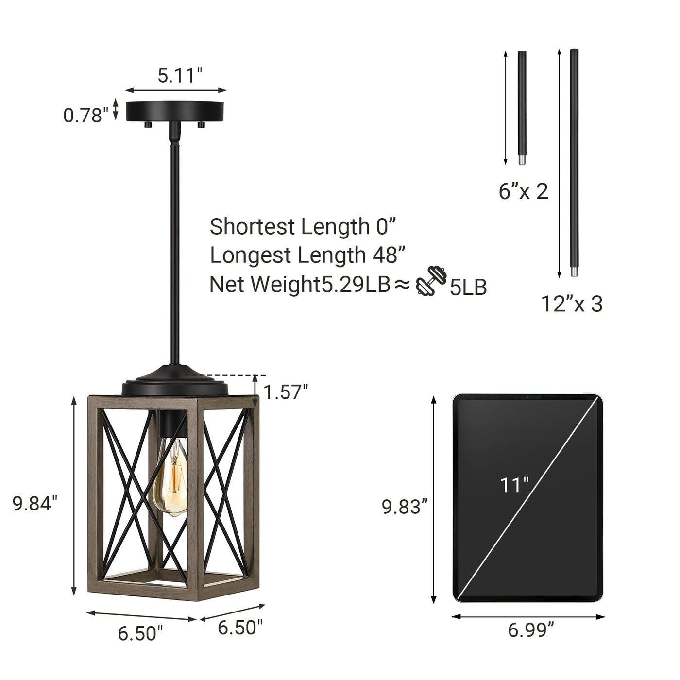 Q: What is the maximum adjustable height for this pendant light?A: This pendant light features adjustable length from 0 inches to 48 inches. It includes five supplied pipes, allowing you to customize the hanging height to meet your needs.