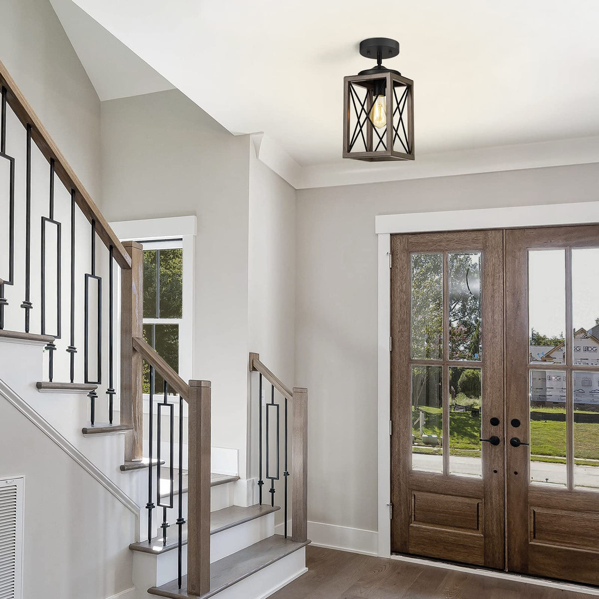 Q: What materials are used in the construction of this pendant light?A: The pendant light is built with a durable metal frame that features a wood grain paint finish, which is anti-rust. The metal pipes help protect internal wires from wear and dust, ensuring longevity and safety.