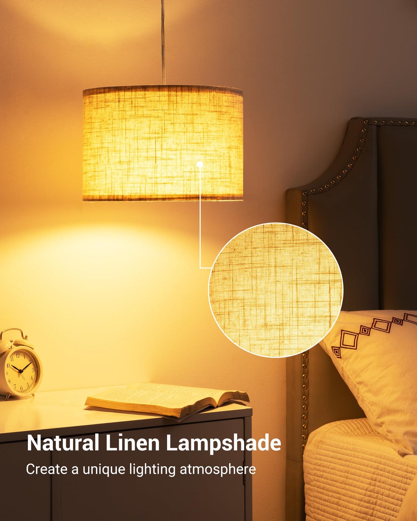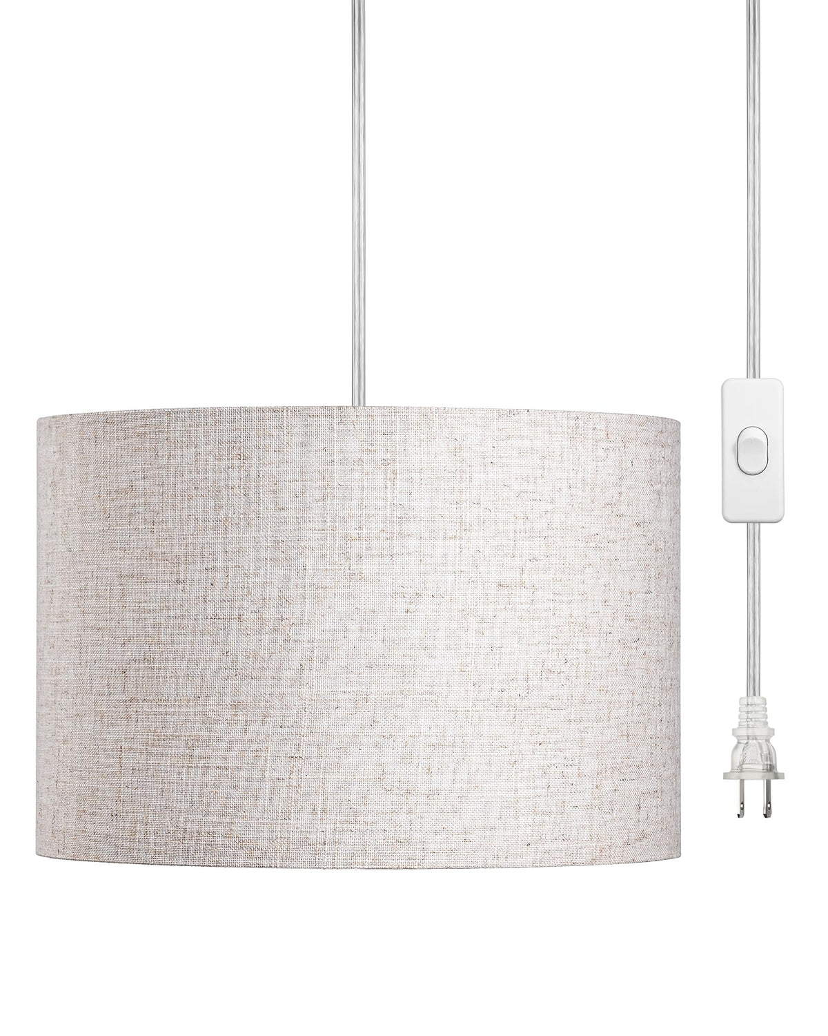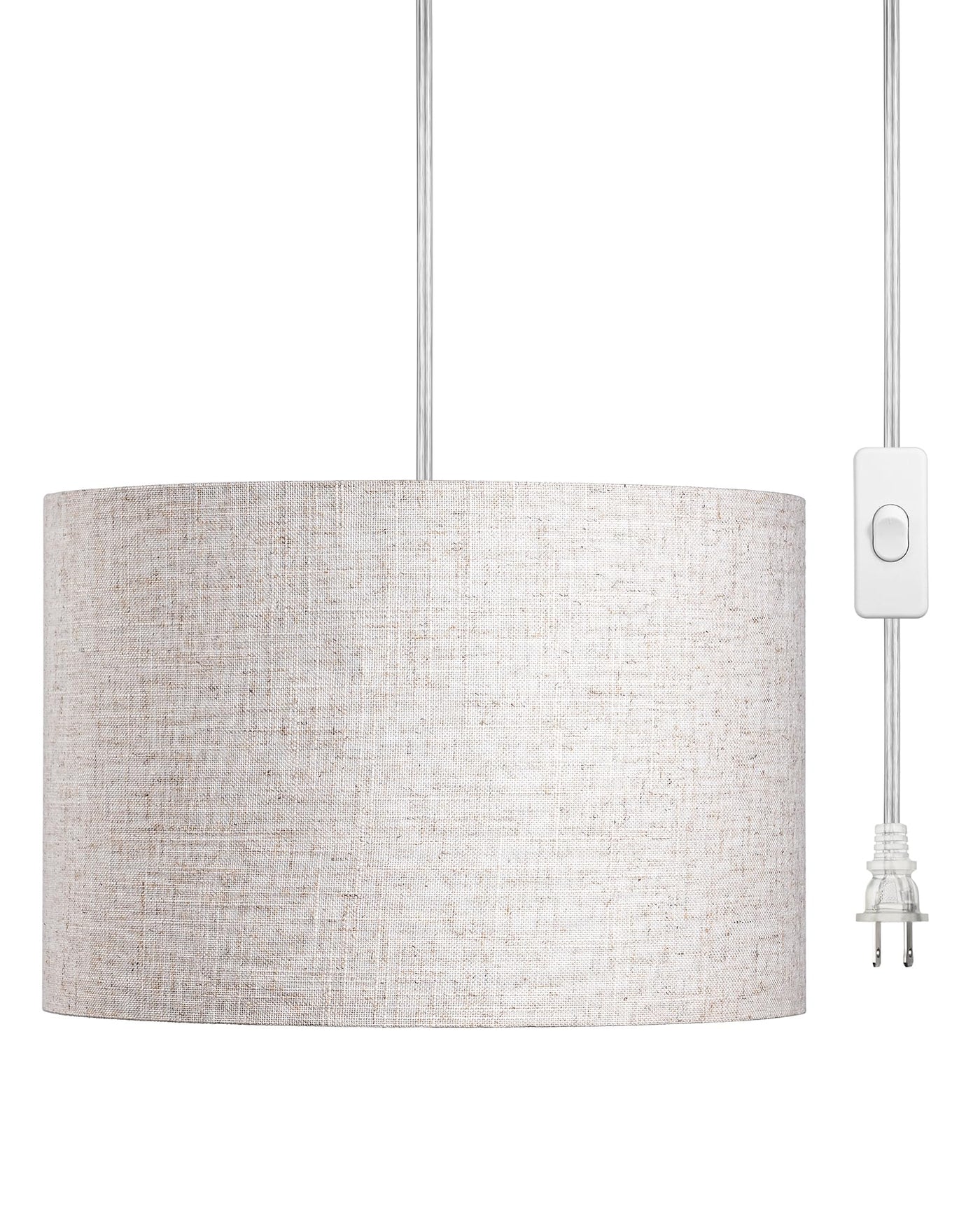 Dewenwils Plug In Pendant Light, Hanging Light With 15Ft Clear Cord, On/Off Switch, Beige Linen Shade, Hanging Light Fixture For