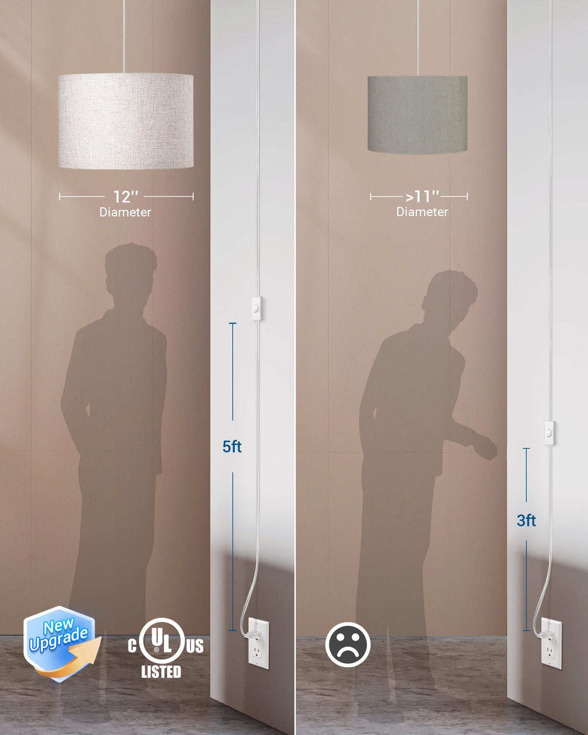 Blending With All Decor Styles You Can Place This Fixture Anywhere In Your Home. The Long Cord Allows To Adjust The Hanging Length And Position Without Worrying Where Your Wall Socket Is Placed. When You Need A Light To Illuminate Your Love Home, When You Need A Light That Can Be Disassembled And Styled At Any Time, Why Not Choose Dewenwils Plug In Pendant, Lighting Up Any Living Space. Packing List: -1 X Plug In Pendant -2 X Ceiling Hooks -2X Wall Anchor -2 X Cord Clip -1 X User Manual Specifications -Input Voltage: 120Vac 60Hz -Max. Load Power: Incandescent Bulb 60W -Socket Type: Standard Medium E26