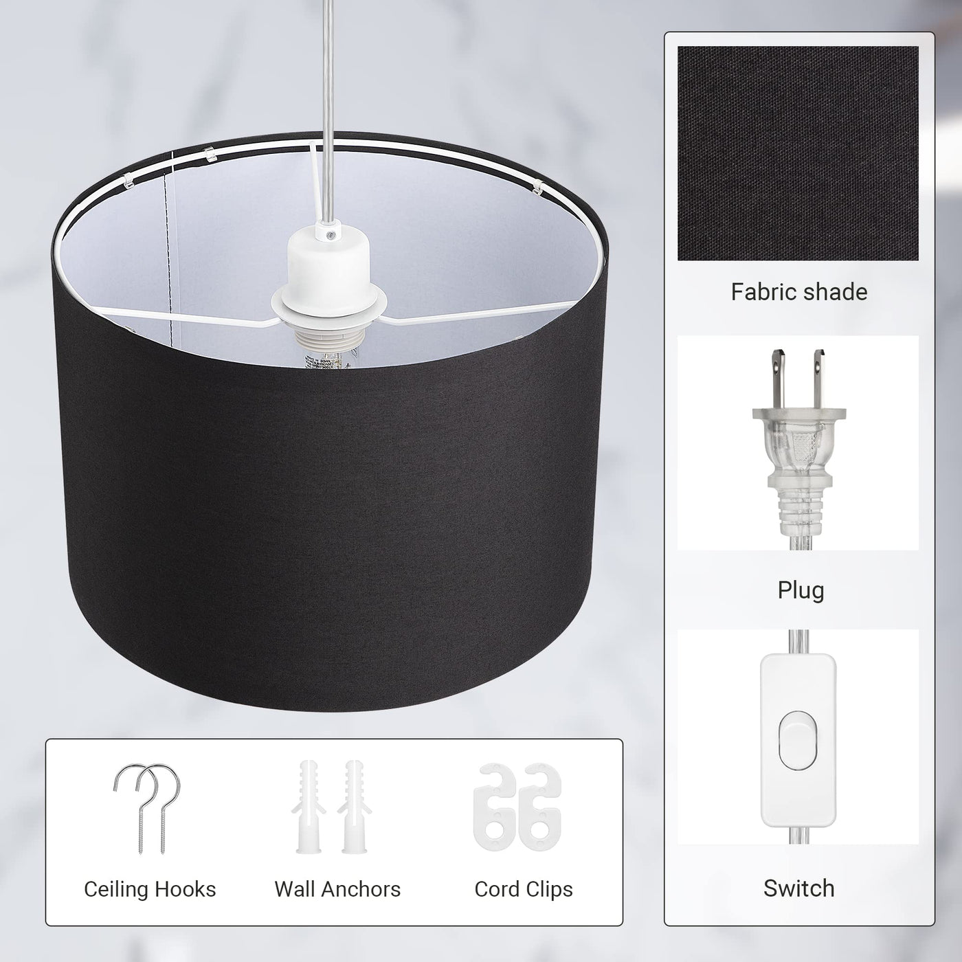 Dewenwils Plug In Pendant Light, Hanging Light With 15Ft Clear Cord, On/Off Switch, With Black Fabric Lampshade, Hanging Light F