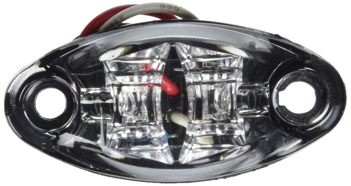 This weatherproof LED marker light with 2 diodes features a dragon's eye design and has 2 self-grounding wires for power and is surface mount. Size - 2-5/8" L x 1-1/4" W x 3/4" D. Color clear, illuminates red.