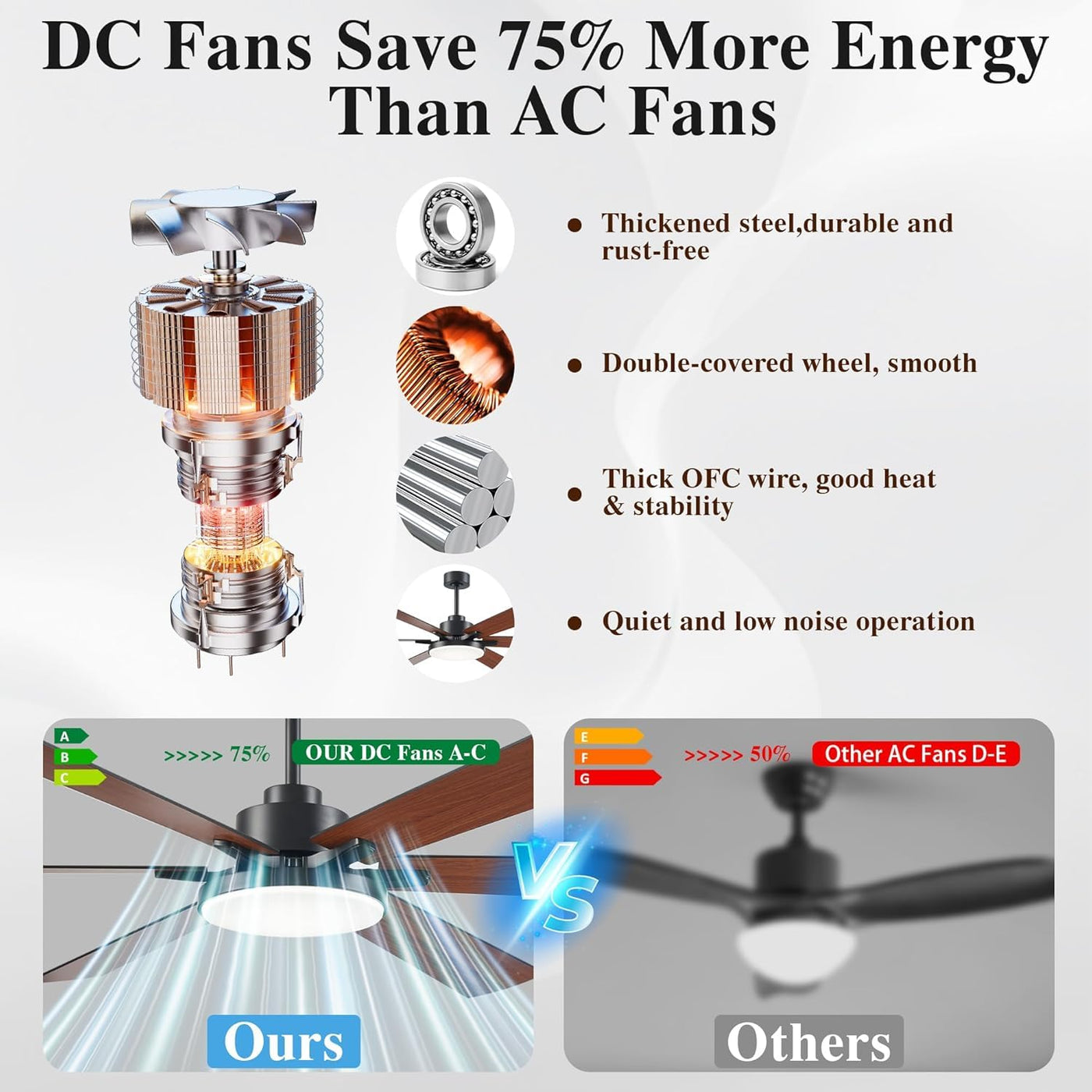 Smart Ceiling Fans With Lights and Remote: Simplify daily comfort with the all-in-one remote control, putting every feature at your fingertips. Seamlessly adjust the fan and 24W LED light to match your mood or needs: toggle the light/fan on/off, choose from 3 customizable color temperatures (3000K warm glow, 4000K natural daylight, 6500K cool white),select from multiple speeds, and set a 1/2-hour auto-off timer for worry-free sleep or energy savings. | Quiet & Efficient DC Motor:Indulge in uninterrupted calm with our big assed industrial ceiling fan
