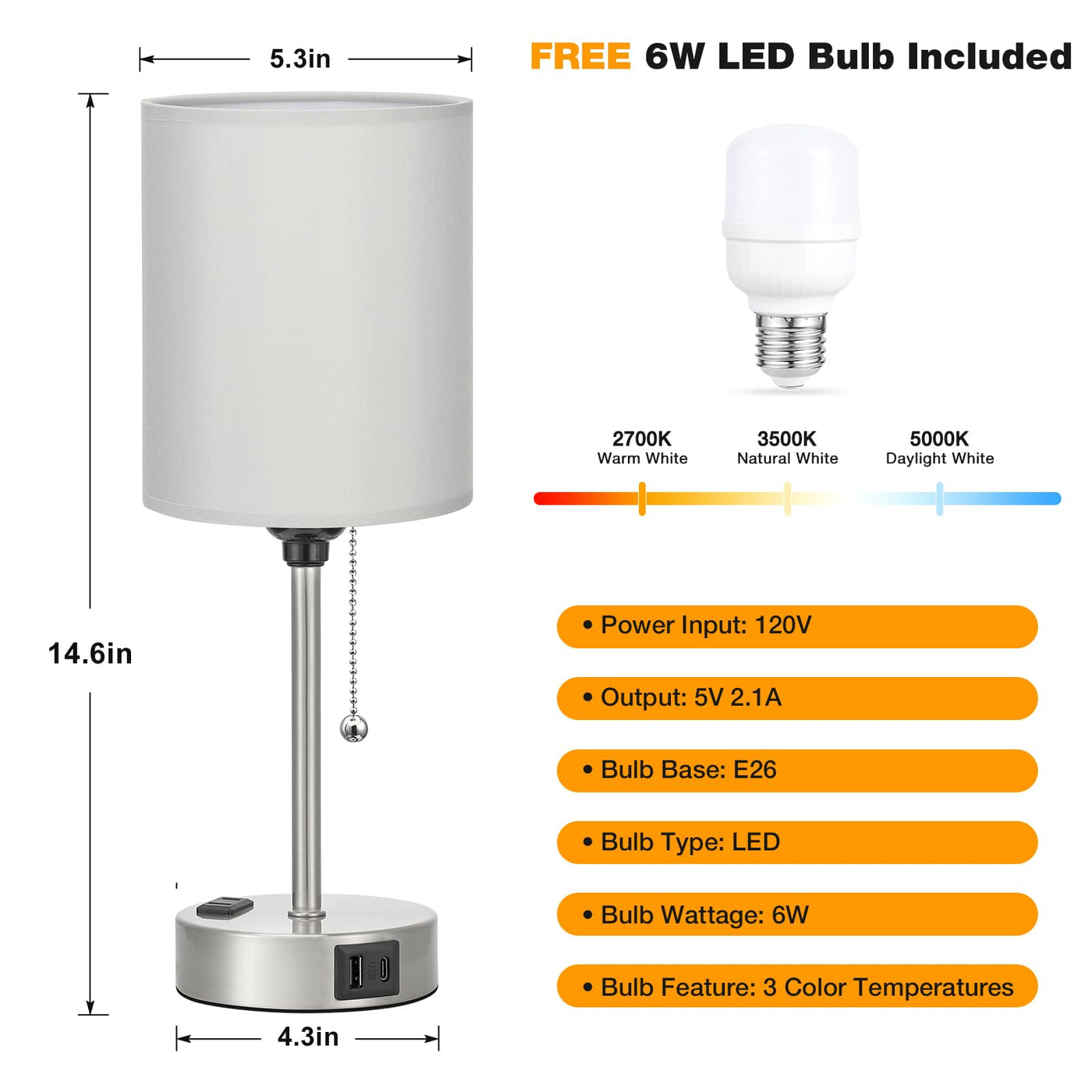 Dicoool Grey Table Lamp With Usb Ports - 3 Color Temperatures, Bedside Lamp For Kids & Girls