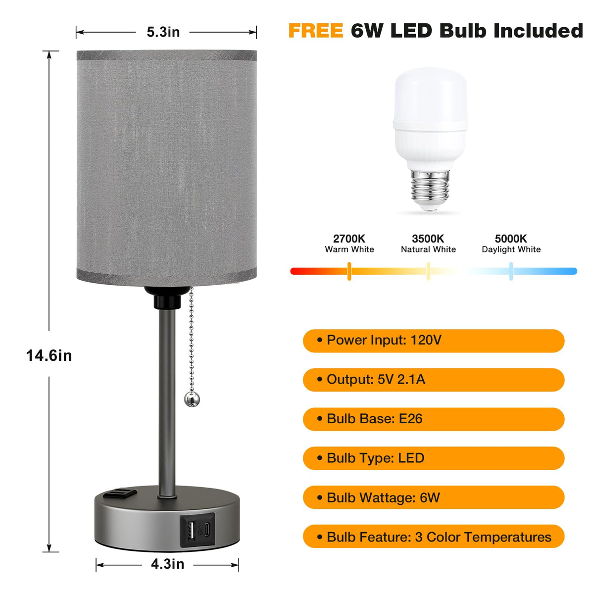 Dicoool Small Grey Bedside Table Lamp For Bedroom - 3 Color Temperatures Bedside Lamps With Usb C And A Ports, Pull Chain Table