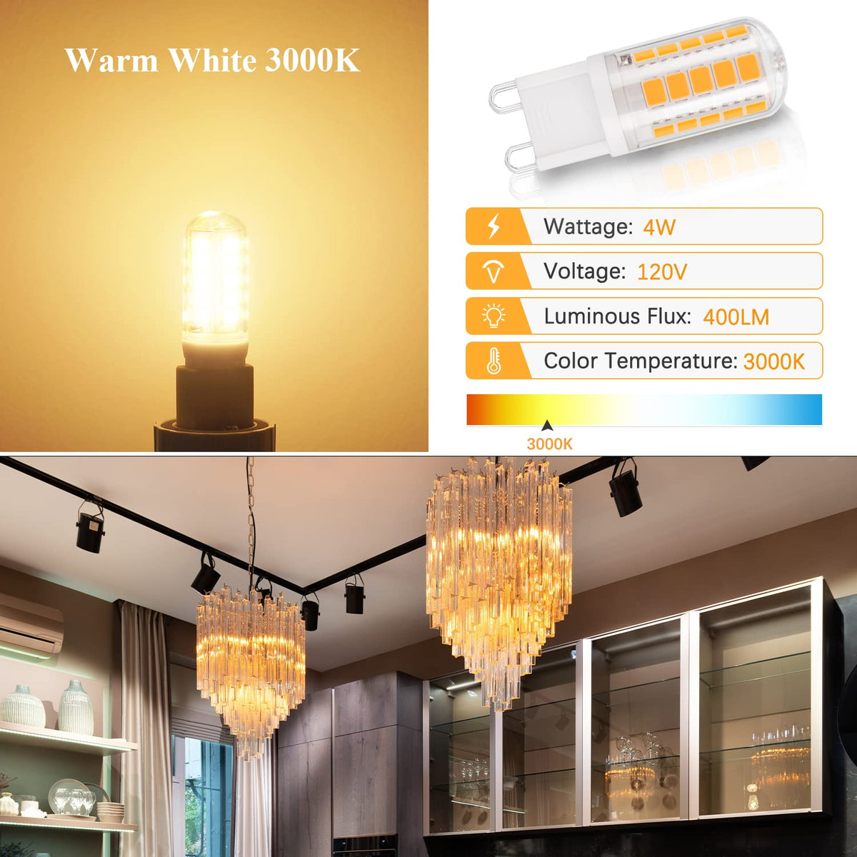 - **Versatile Application**: The standard G9 bi-pin base allows for easy installation in various fixtures, from crystal chandeliers and pendant lights to desk lamps and ceiling fans. Its versatility makes it an excellent choice for bathrooms, dining rooms, living rooms, bedrooms, and kitchens.