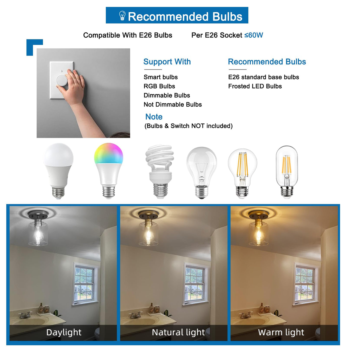 Q: What types of bulbs are compatible with the DIDUIO Semi Flush Mount Ceiling Light?A: The DIDUIO Semi Flush Mount Ceiling Light is compatible with all E26 base LED bulbs, incandescent bulbs, and halogen bulbs, with a maximum wattage of 60W. For energy efficiency, we recommend using LED bulbs.