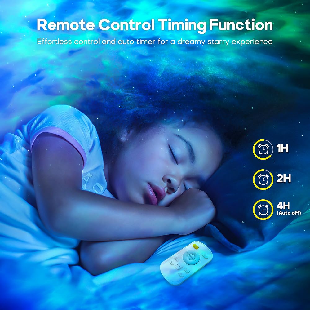 - **Convenient Remote Control & Timer**: Easily manage your lighting experience with the included remote control, allowing you to turn the projector on/off, change modes, and adjust brightness and speed. The built-in timer feature lets you set it to turn off automatically after 1, 2, or 6 hours, ensuring peace of mind as you drift off to sleep.