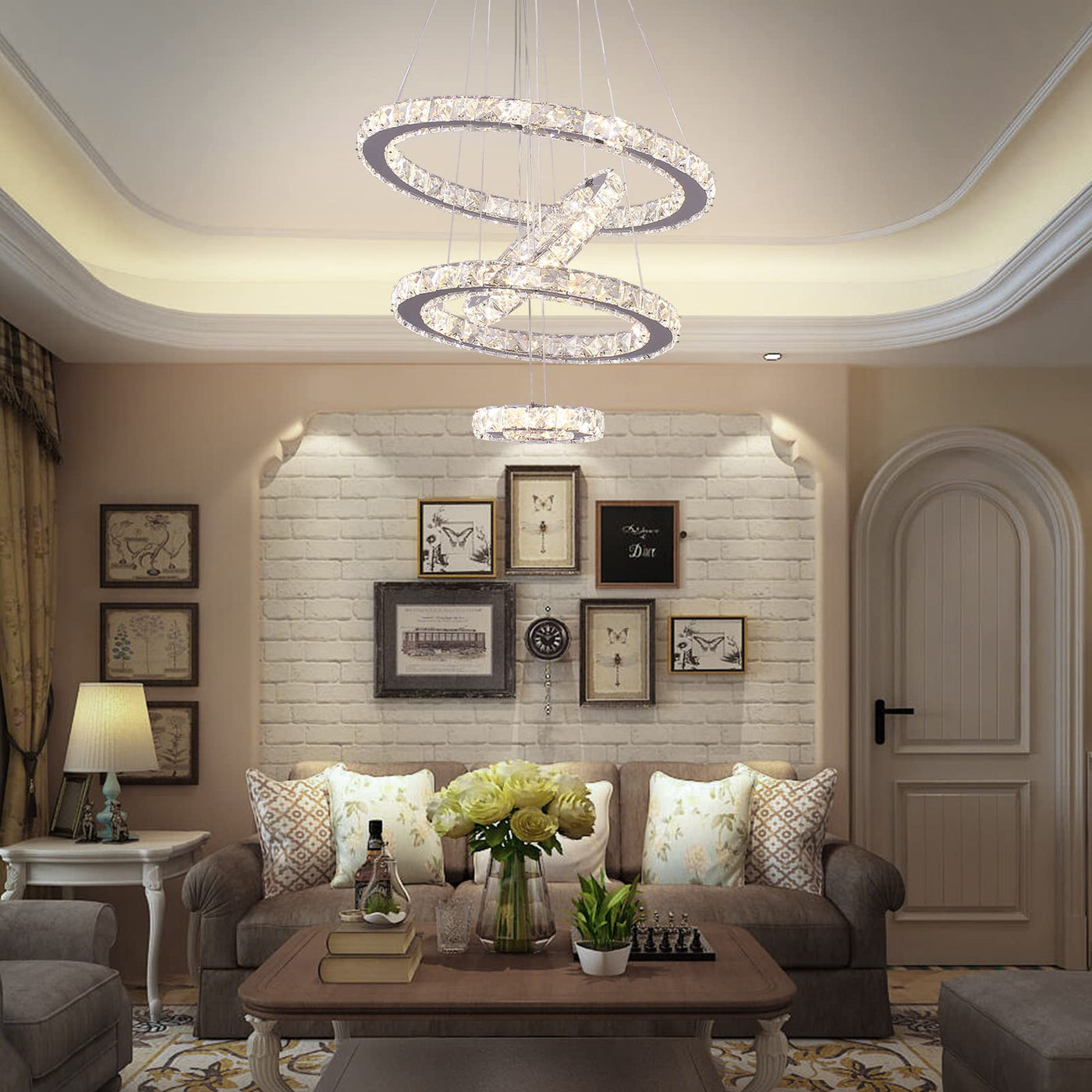 Q: What are the dimensions of the Dixun Crystal Chandelier?A: The Dixun Crystal Chandelier features adjustable ring sizes with diameters of 5.9 inches, 9.8 inches, 13.7 inches, and 17.7 inches (150mm, 250mm, 350mm, and 450mm respectively), making it versatile for various spaces.