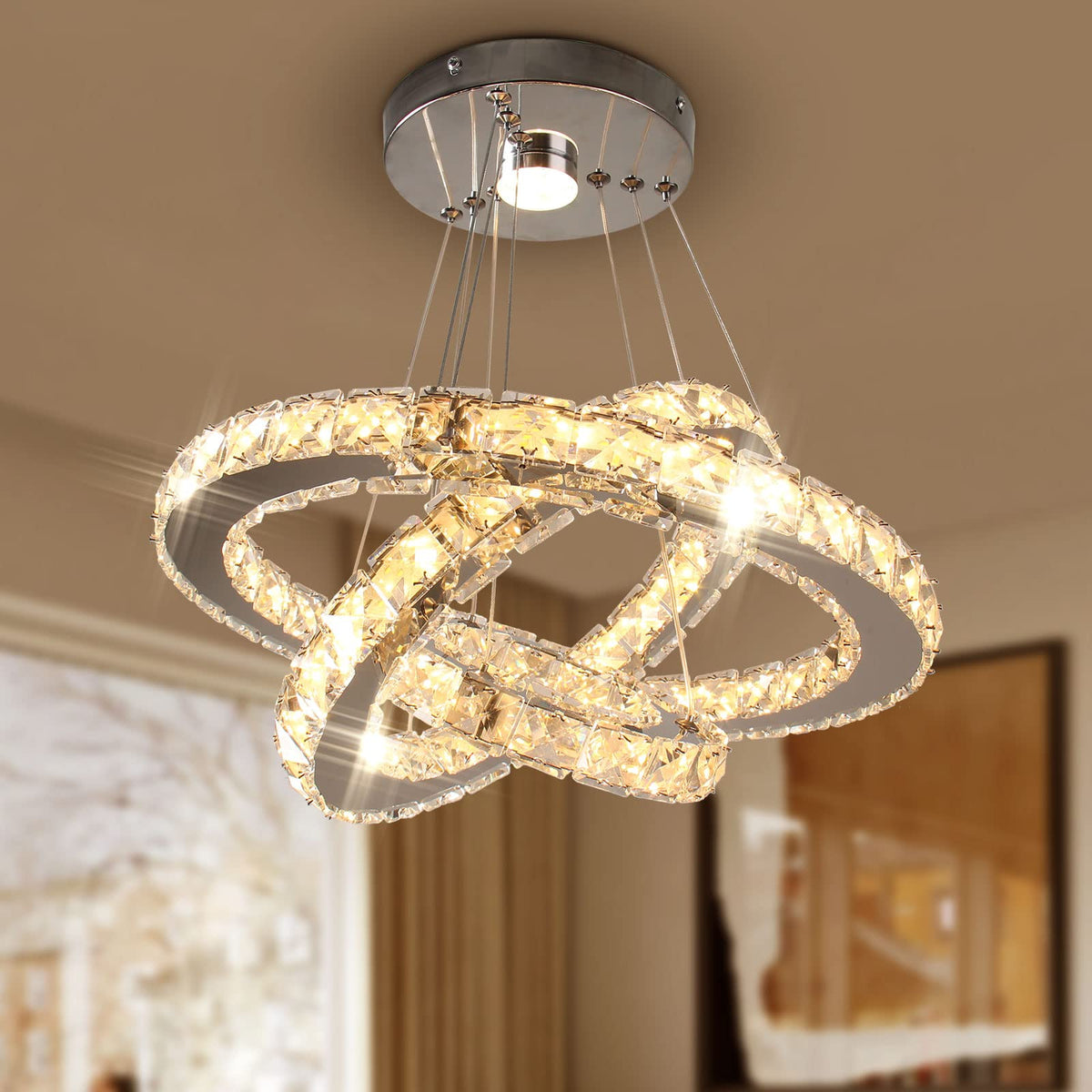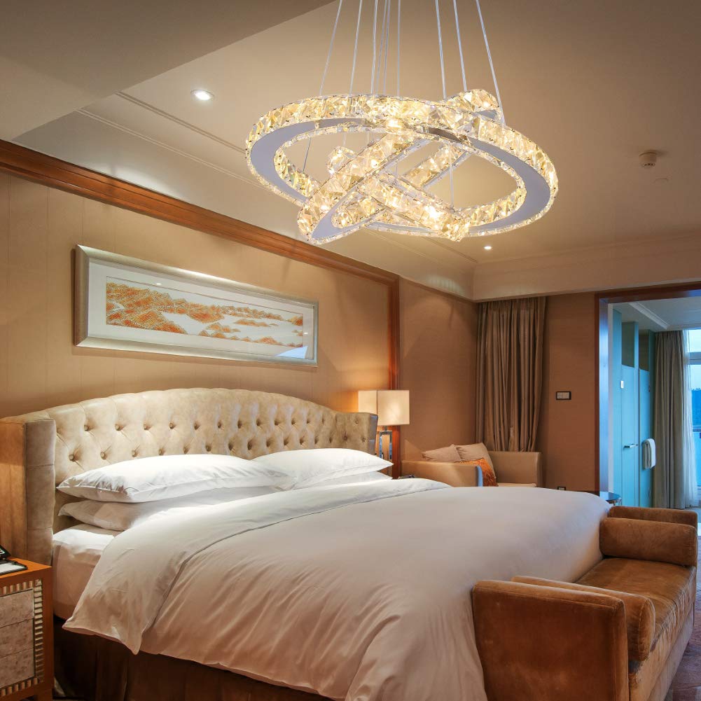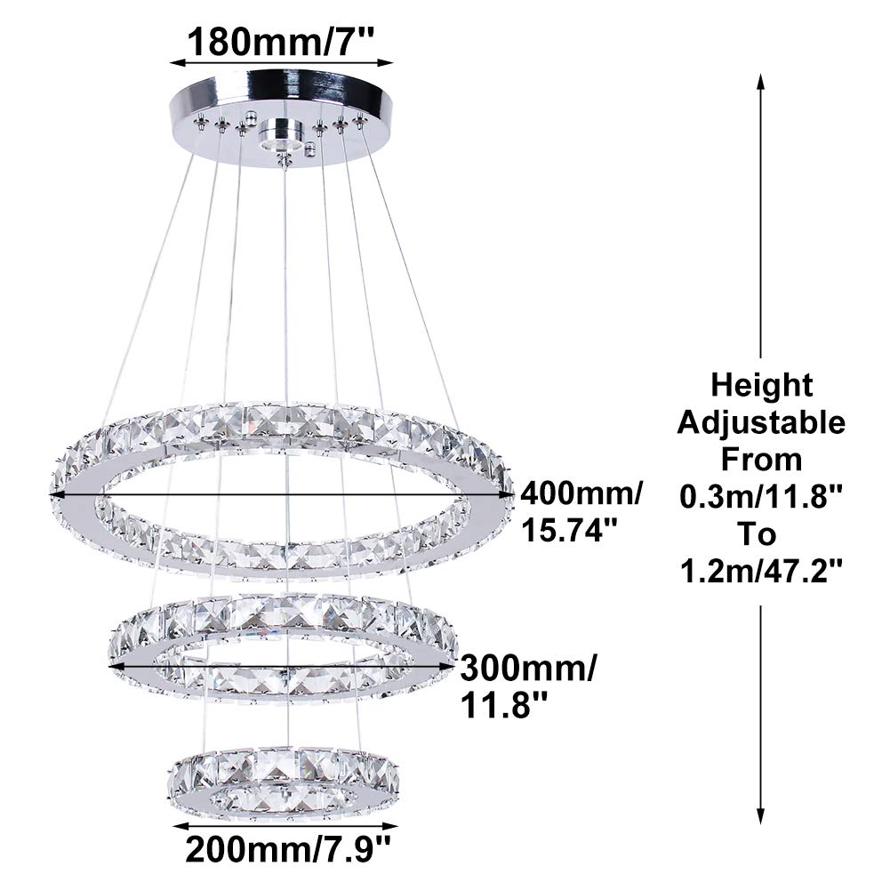 Diisunbihuo Modern Crystal Led Chandelier, Adjustable 3 Rings Pendant Light, Warm White