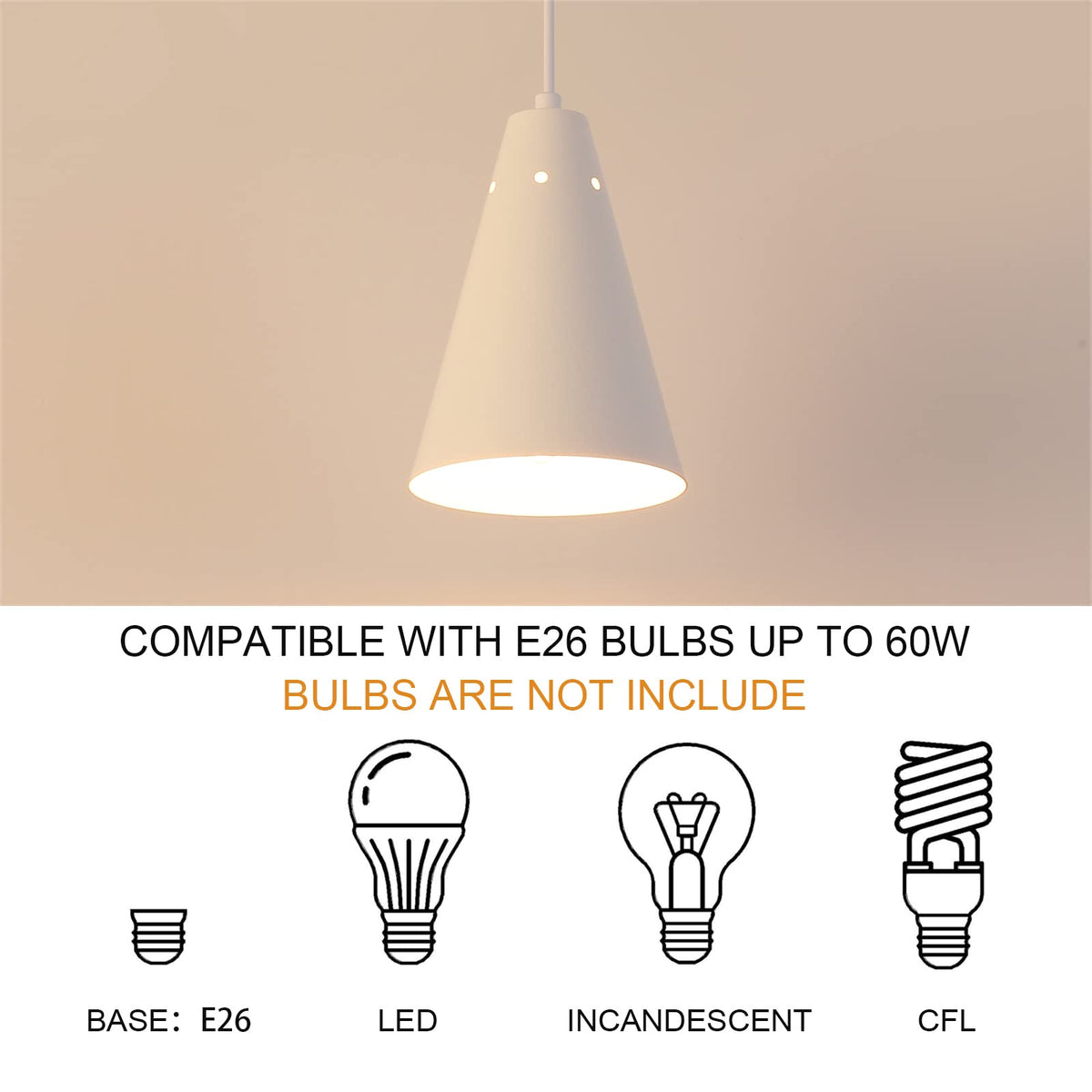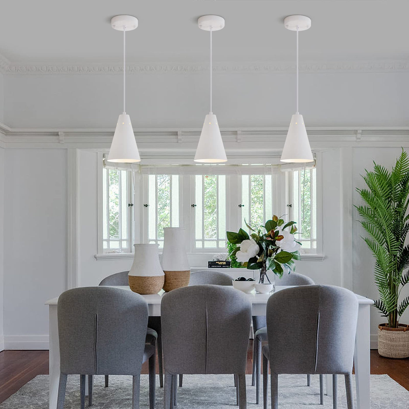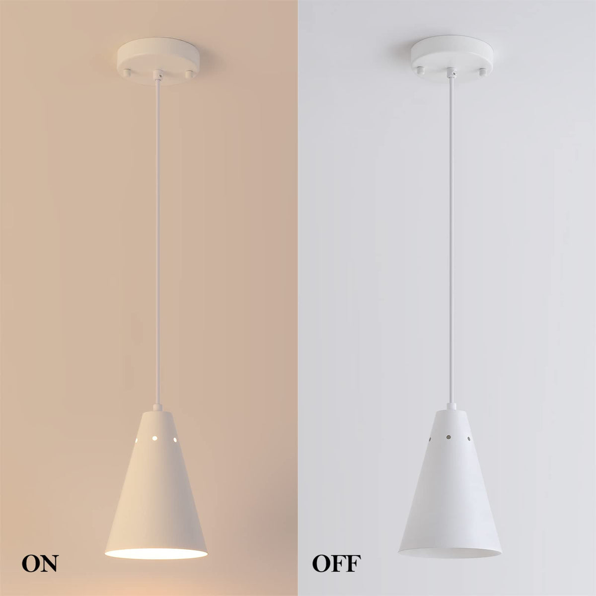 Crafted From well-made Metal, These Pendant Lights Feature A Fashionable Geometric Cone Design That Seamlessly Blends Modern, Industrial, And Farmhouse Styles. The Matte White Finish Adds A Clean And Elegant Look, Making Them A Perfect Fit For Various Interior Décors. Each Light Fixture Measures 5.32 Inches In Diameter And 7.8 Inches In Height, With A Canopy Size Of 4.72 Inches In Diameter. The Adjustable Cord Length Of 59 Inches Allows For Customized Hanging Heights, Accommodating Both Flat And Slightly Sloped Ceilings. These Lights Are Designed For Indoor Use Only, Ensuring Their Longevity And Performance In Your Home.