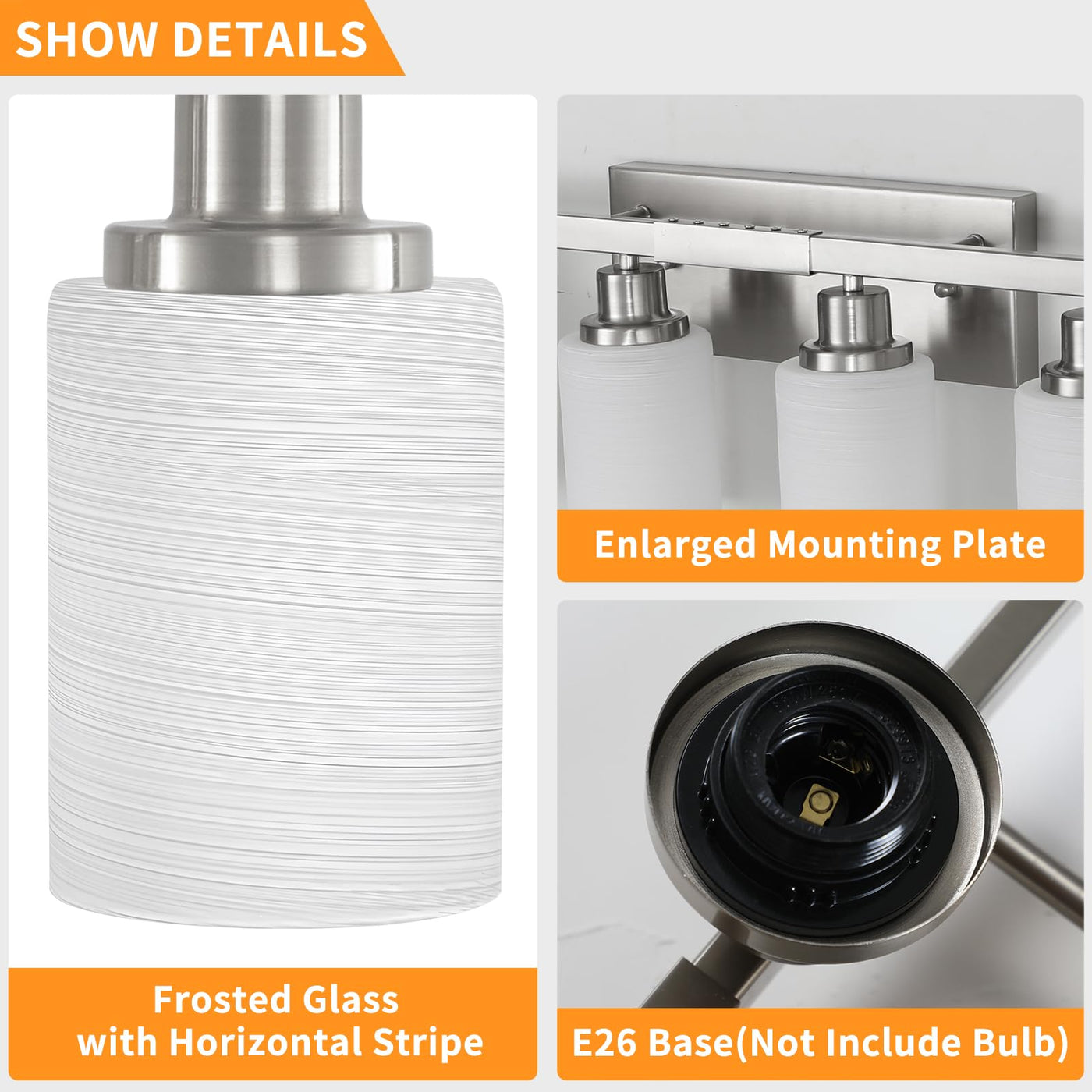Perfect Bathroom Light Fixtures to decorate your home! The wall fixture is perfect for your home decoration, the idea for the top side of a mirror or bed, a doorway or entryway, lining an office or hotel hallway, or under a covered porch or patio. Why Does This Wall Sconce Light Deserve Your Purchase? 1.Superior Durable Material This bathroom light fixture uses premium metal with brushed nickel baking varnish which is anti-rust and anti-corrosion. High-quality metal material allows you to use years without any worries. The thick lampshade makes the wall sconce holder dustproof and waterproof, so it can be applied to the bathroom, laundry room, powder room, and more. 2.Modern & Exquisite Design Our nickel bathroom light fixtures are perfect for vintage farmhouse and contemporary decors, A brushed nickel base complements the impurity-free glass heightening the classic industrial look of this vanity light, a gorgeous bathroom vanity light that still provides a good amount of light, so simple but makes your home much more updated. 3.Wide Applications The bathroom lights over the mirror can be mounted with the light up or down according to your demand. Perfect for the bathroom mirror or bed, a doorway or entryway, closet, living room, mirror cabinets, dressing table, porch, or corridor, it can be a perfect decoration at your home and other places.