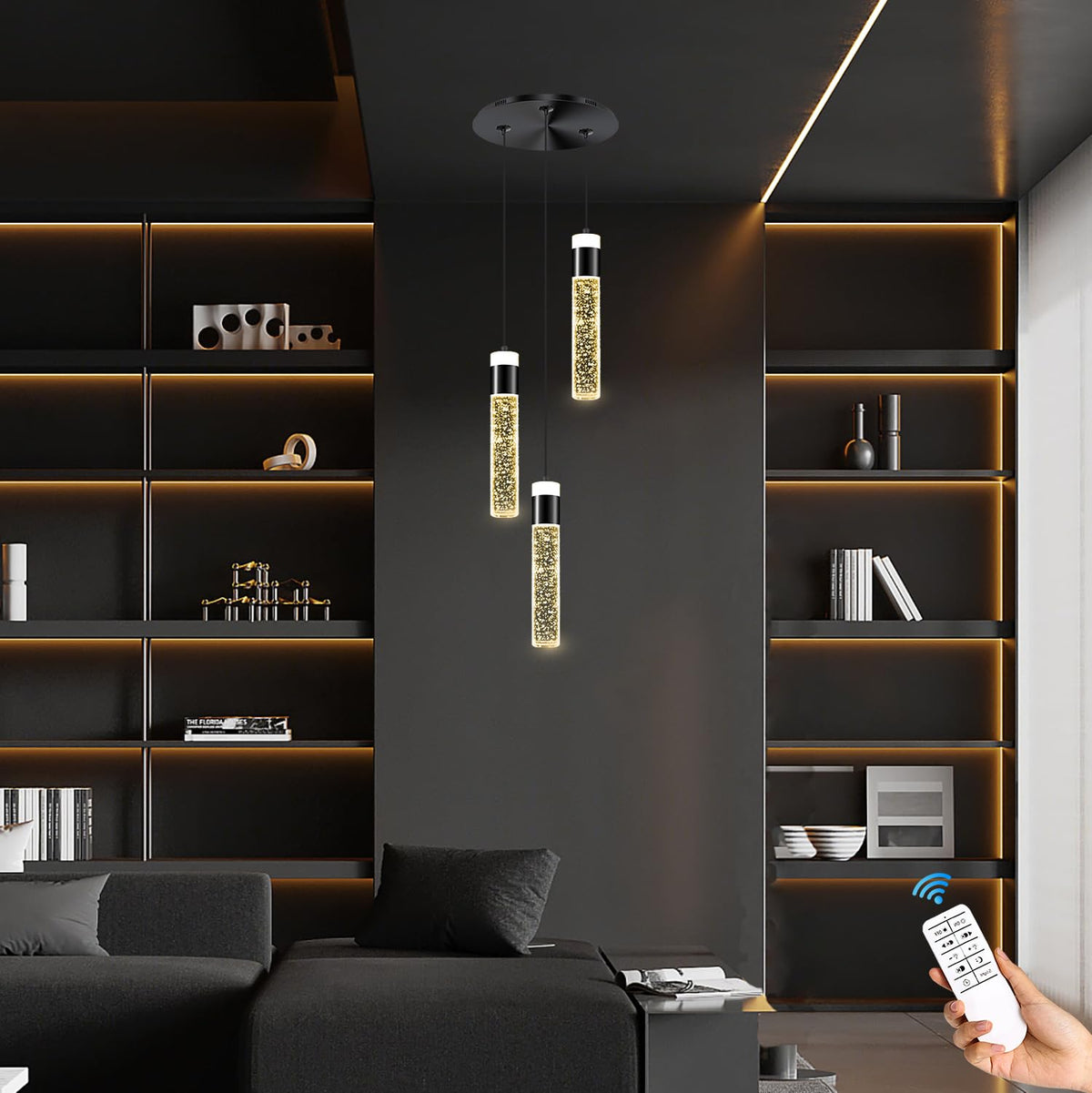 Q: What type of bulbs does this pendant light use?A: This pendant light includes three 8W LED bulbs, providing a total brightness of 1920 lumens. The bulbs are remote control dimmable, allowing you to adjust the color temperature between 3000K and 6000K and brightness from 5% to 100%.