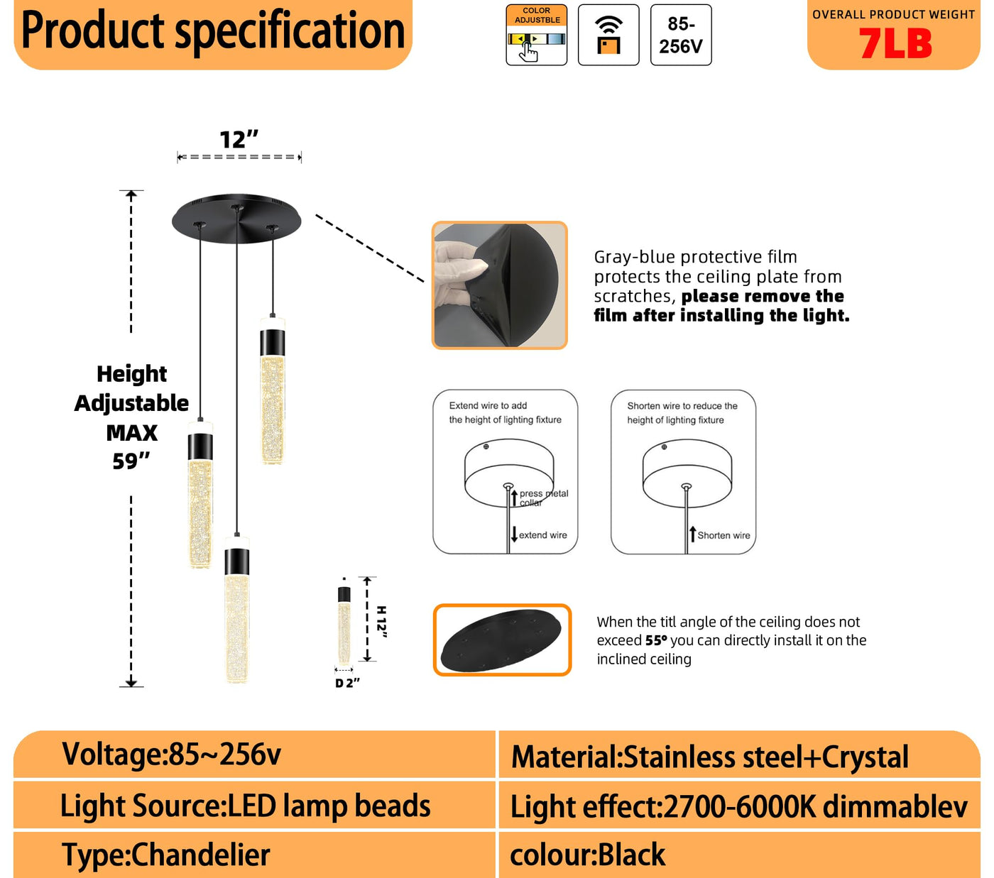 Q: What is the adjustable height range of the Dimmable 3-Light Pendant Light?A: The adjustable height of this ceiling hanging light fixture ranges from 1 inch to 59 inches, allowing you to customize the hanging length to fit your space perfectly.